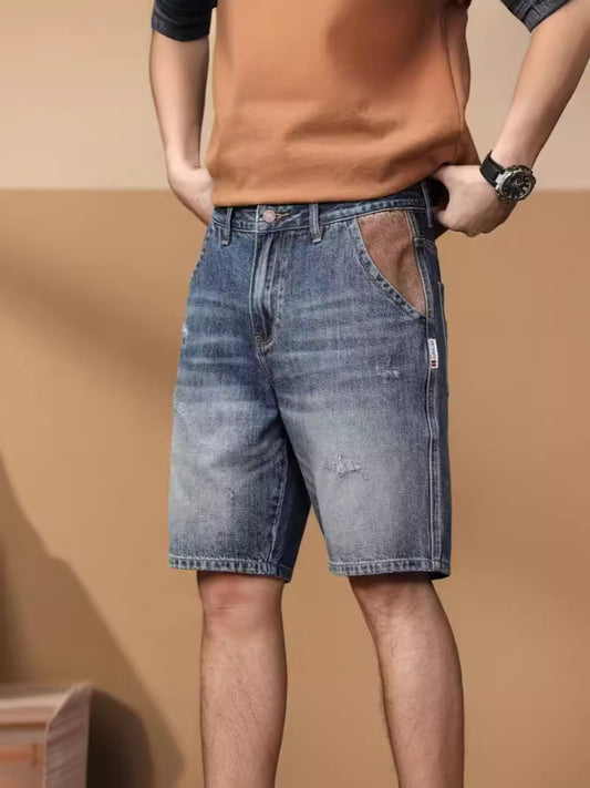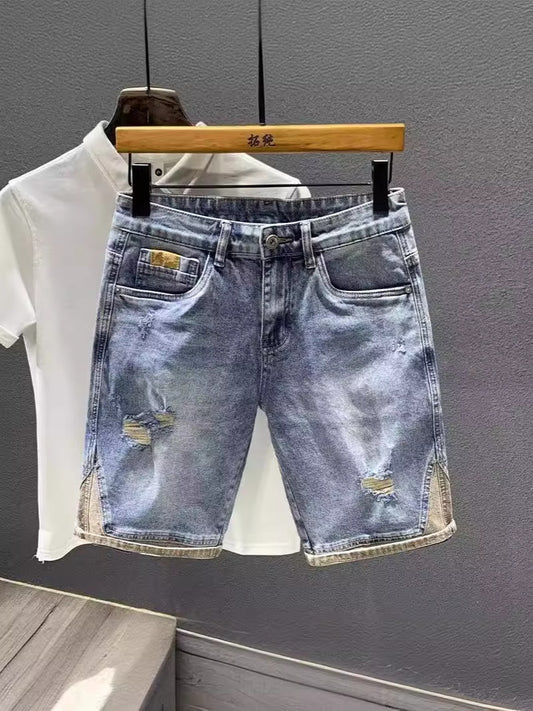 ♜ 𝔽𝕦𝕤𝕚𝕠𝕟 𝔽𝕠𝕔𝕦𝕤 𖥟 𝖏𝖊𝖆𝖓𝖘 ☞ 夏季薄款輕奢潮牌高端復古破洞牛仔短褲拼接彈力五分褲 Bs-01