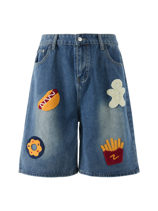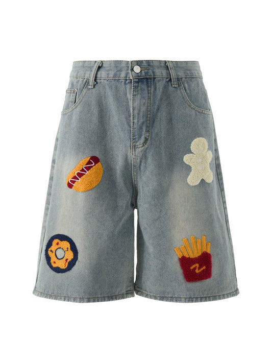 ♜ 𝔽𝕦𝕤𝕚𝕠𝕟 𝔽𝕠𝕔𝕦𝕤 𖥟 𝖏𝖊𝖆𝖓𝖘 ☞ 美式復古熱狗堡薯條牛仔短褲男女款創意通勤寬鬆闊腿直筒五分褲 Bs-14