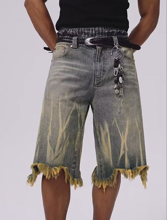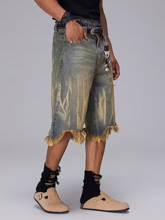 ♜ 𝔽𝕦𝕤𝕚𝕠𝕟 𝔽𝕠𝕔𝕦𝕤 𖥟 𝖏𝖊𝖆𝖓𝖘 ☞ 美式潮牌刷色黄泥染洗水做舊男女牛仔短褲寬鬆五分版型褲 Bs-06