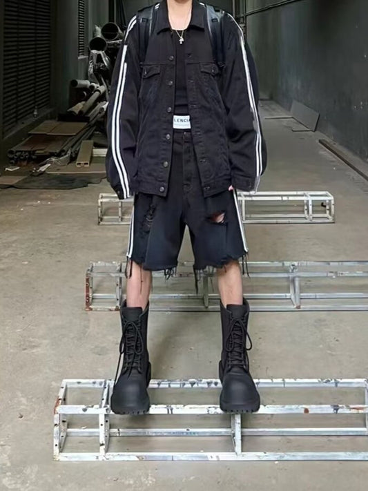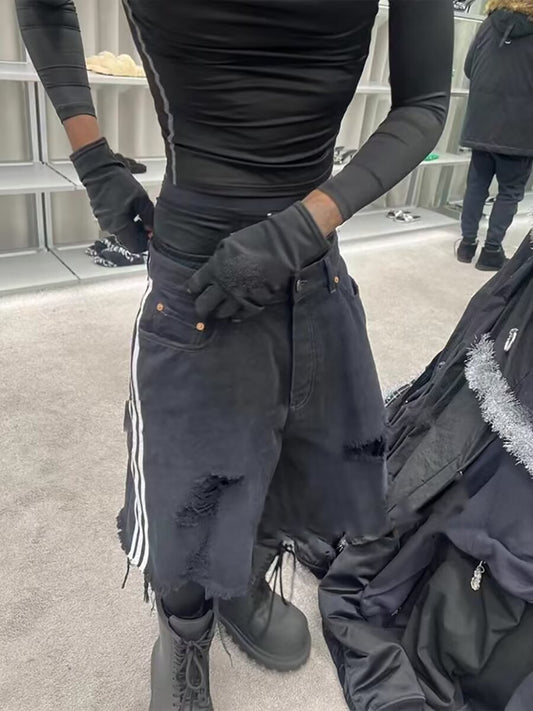 ♜ 𝔽𝕦𝕤𝕚𝕠𝕟 𝔽𝕠𝕔𝕦𝕤 𖥟 𝖏𝖊𝖆𝖓𝖘 ☞ 水洗磨破做舊三條杠牛仔短褲男款破壞破洞短褲美式寬鬆休閒五分褲 Bs-13