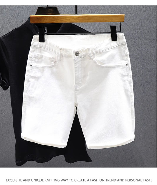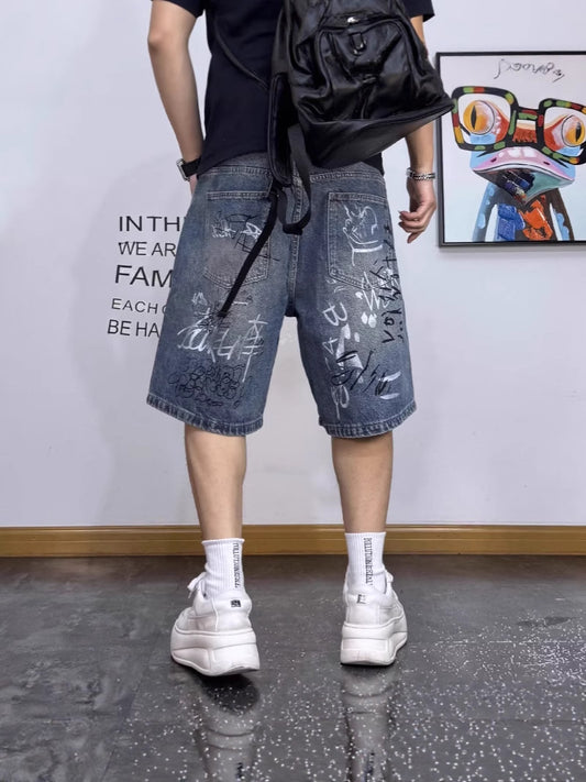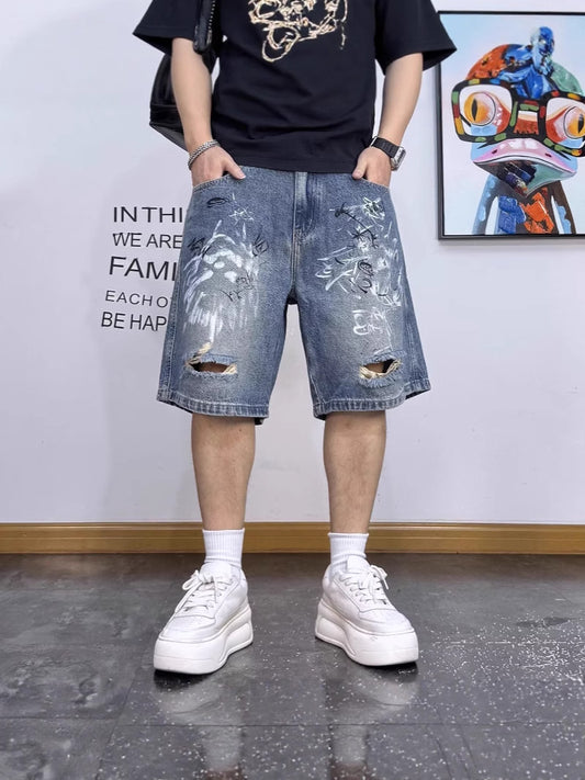 ♜ 𝔽𝕦𝕤𝕚𝕠𝕟 𝔽𝕠𝕔𝕦𝕤 𖥟 𝖏𝖊𝖆𝖓𝖘 ☞ 白色牛仔短褲修身潮牌百搭彈力塗鴉印花时尚五分褲 Bs-11