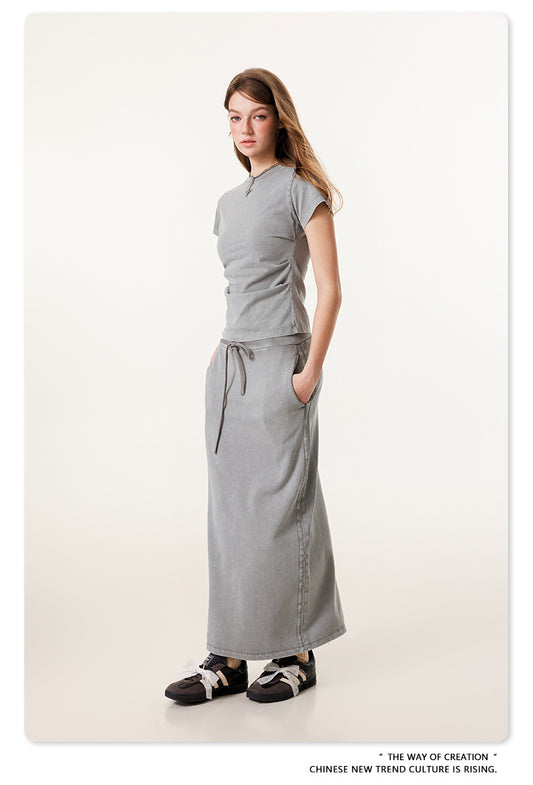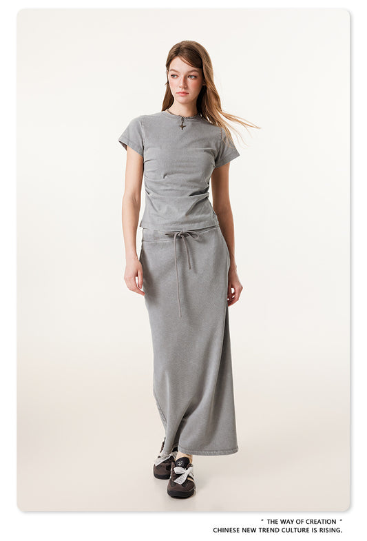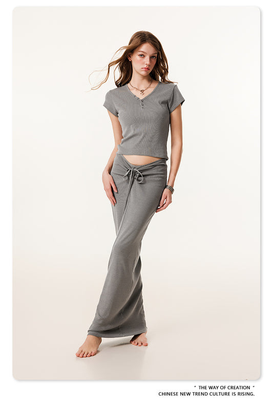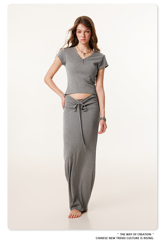 Fierce & Fitted 夏季辣妹必備INS緊身短款上衣 收腰直筒長裙套裝N-7 淺灰色