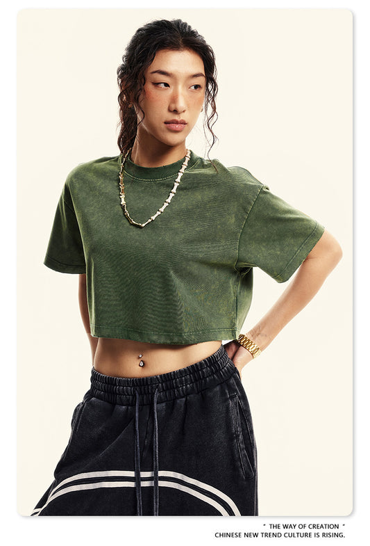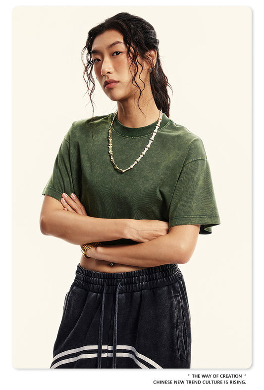 Fierce & Fitted 夏季美式復古做舊辣妹短款T袖N-6 水洗墨綠