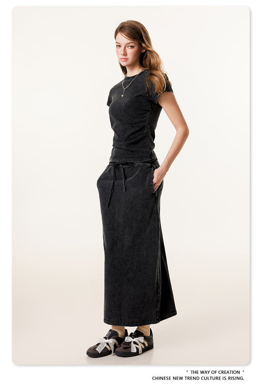 Fierce & Fitted 夏季辣妹必備INS緊身短款上衣 收腰直筒長裙套裝N-7 深灰色