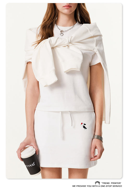 Fierce & Fitted 美式夏季甜妹小狗刺繡圓領短T半身裙套裝N-51 牙白色