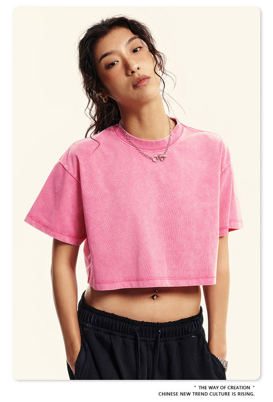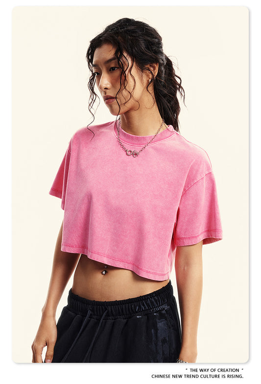 Fierce & Fitted 夏季美式復古做舊辣妹短款T袖N-7 水洗玫紅