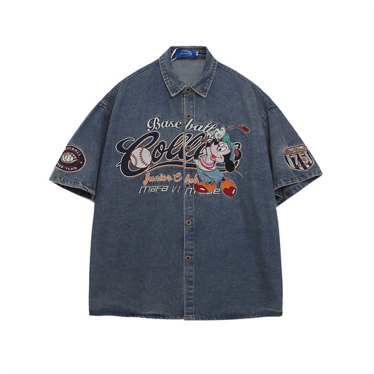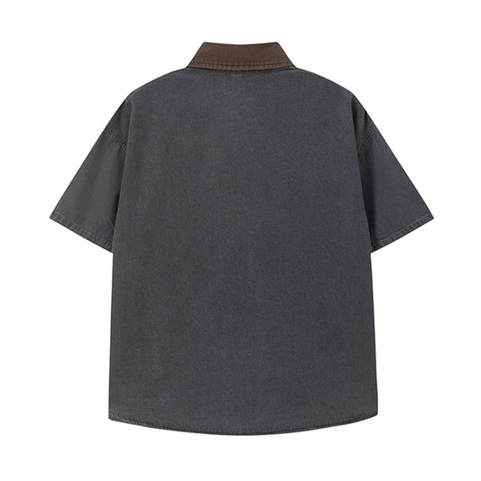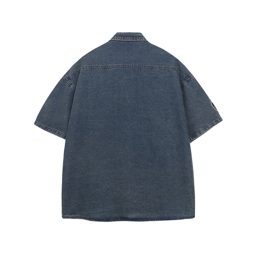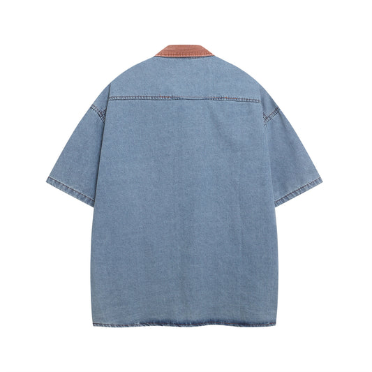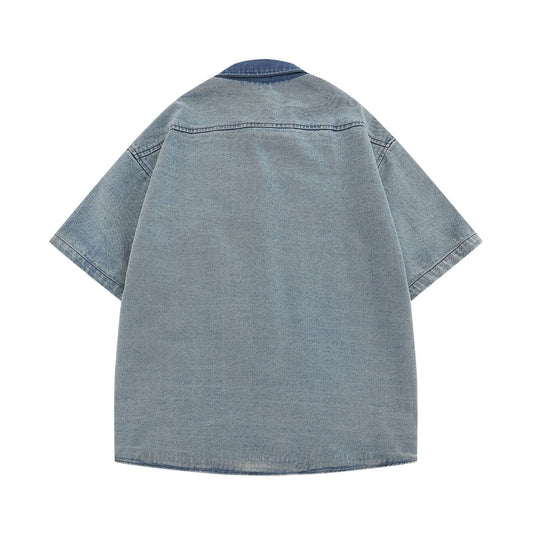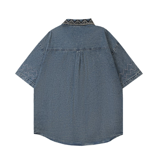 𝔼mbro 𝕊hirt𒉽美式復古重工藝撞色刺繡牛仔寬鬆短袖襯衫外套