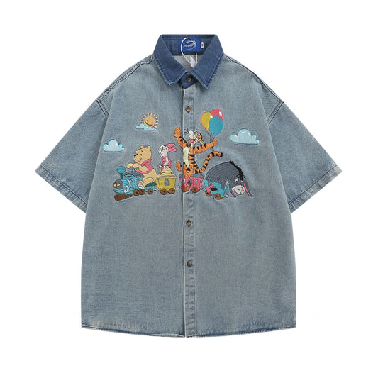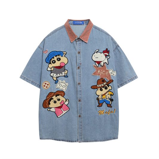 𝔼mbro 𝕊hirt𒉽日式復古可愛刺繡牛仔翻領寬鬆襯衫C-7#