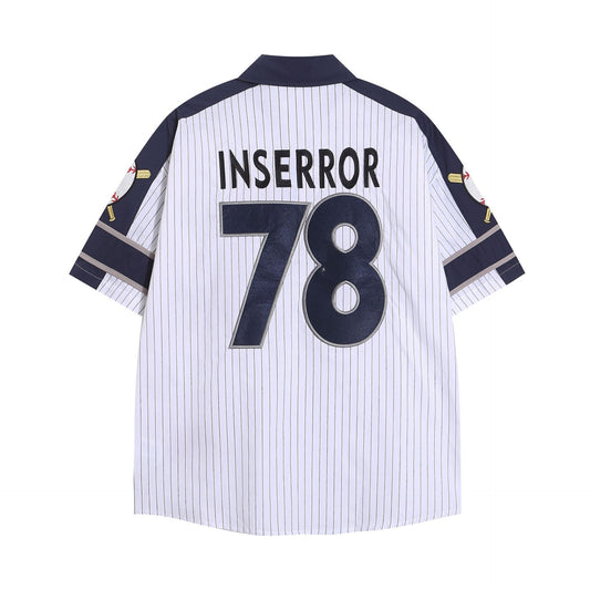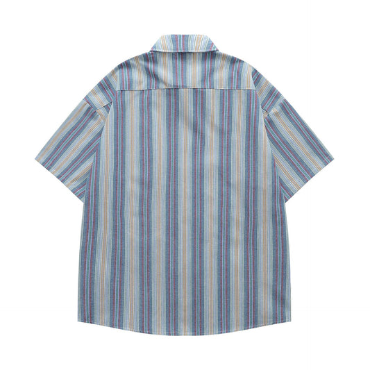 𝔼mbro 𝕊hirt𒉽日式復古字母刺繡條紋百搭休閒短袖襯衫 (藍色)