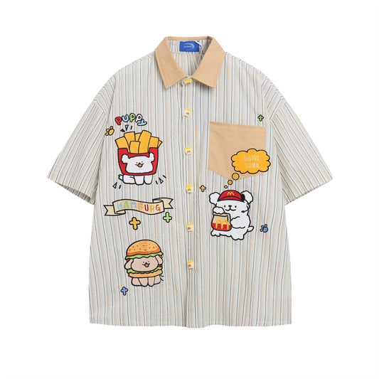 𝔼mbro 𝕊hirt𒉽美式復古可愛小狗刺繡印花短袖寬鬆襯衫外套IN-730