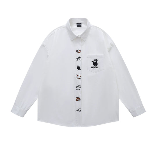 𝔼mbro 𝕊hirt𒉽趣味貓咪繡花袖襯衫(白色)