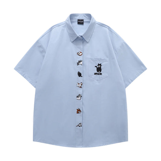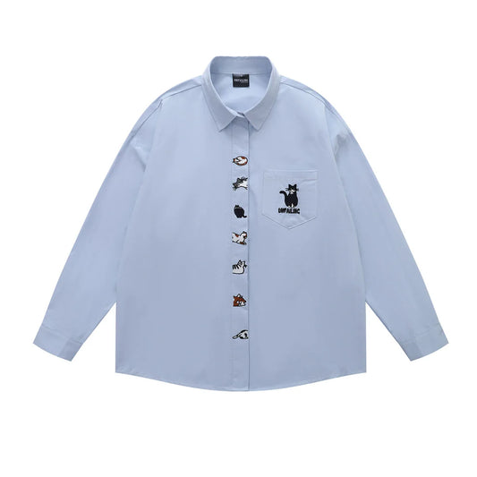 𝔼mbro 𝕊hirt𒉽趣味貓咪繡花袖襯衫(藍色)
