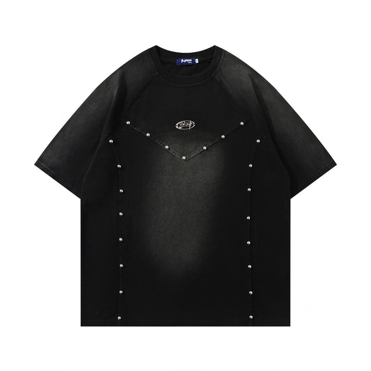 𝕃oose 𝔽it ☞𝟤𝟢𝟤𝟧 ☜美式復古拼接鉚釘圓領男女中性 T-Shirt寬版上衣J-5