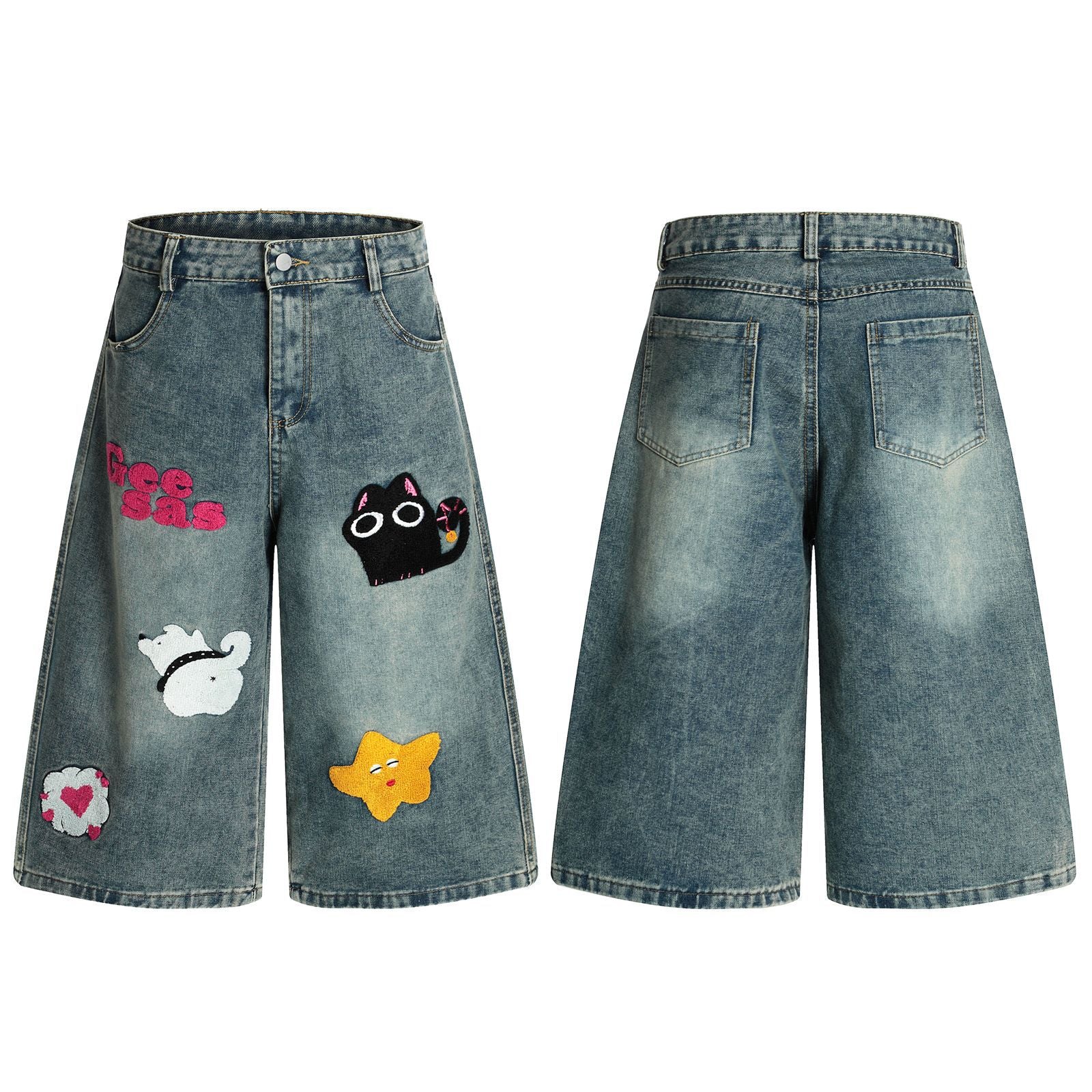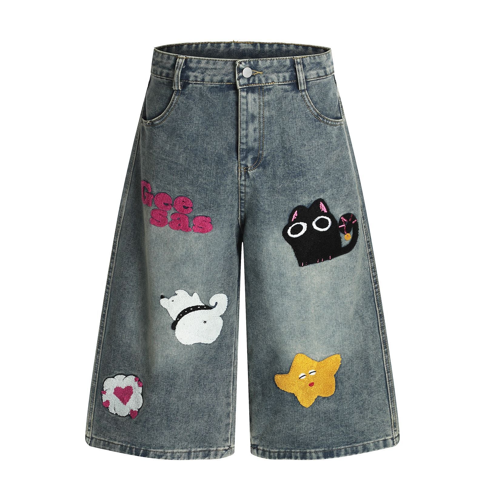 𖥟𝕽𝖊𝖑𝖆𝖝𝖊𝖉 𝖋𝖎𝖙 ☞美式復古水洗圖案刺繡牛仔七分褲G-83