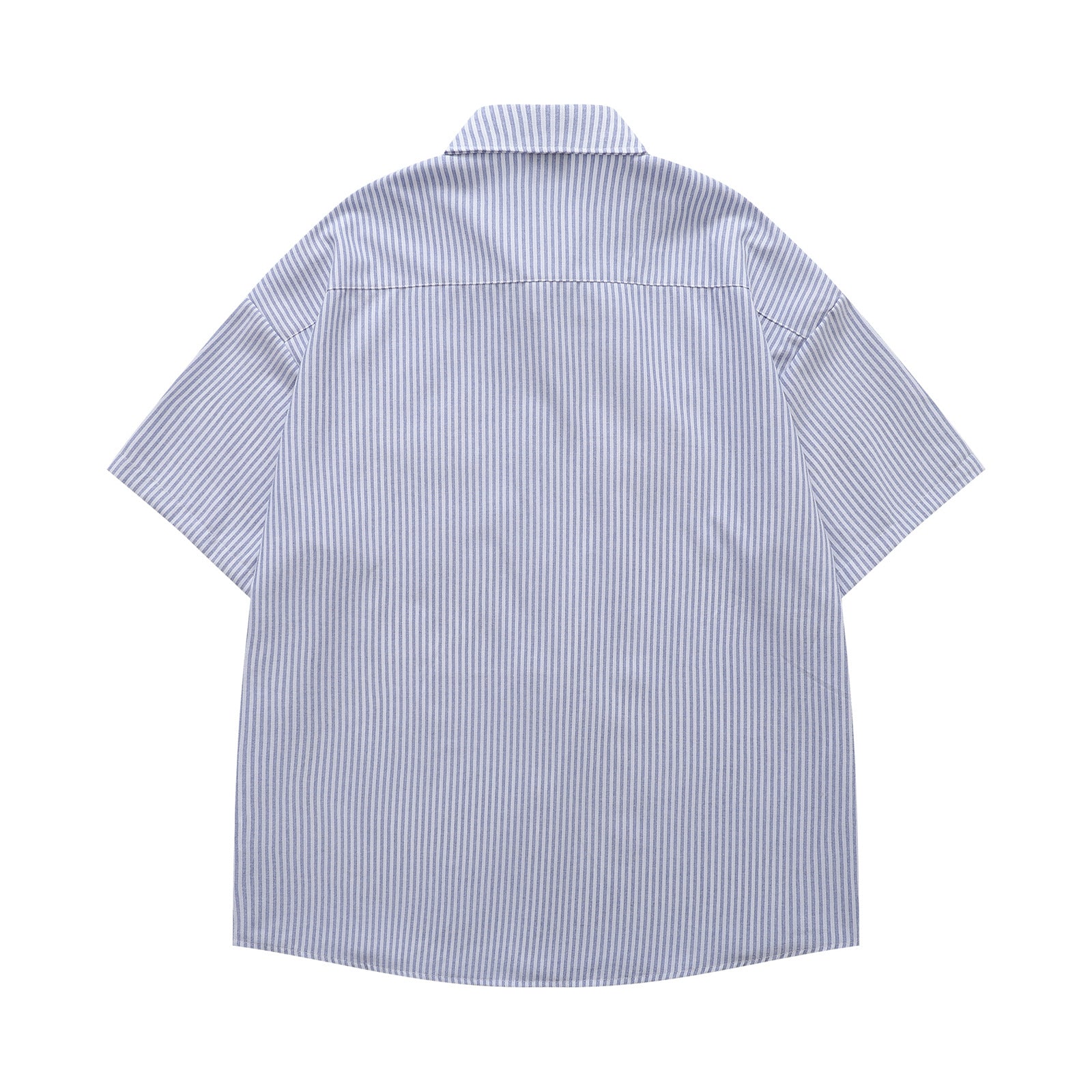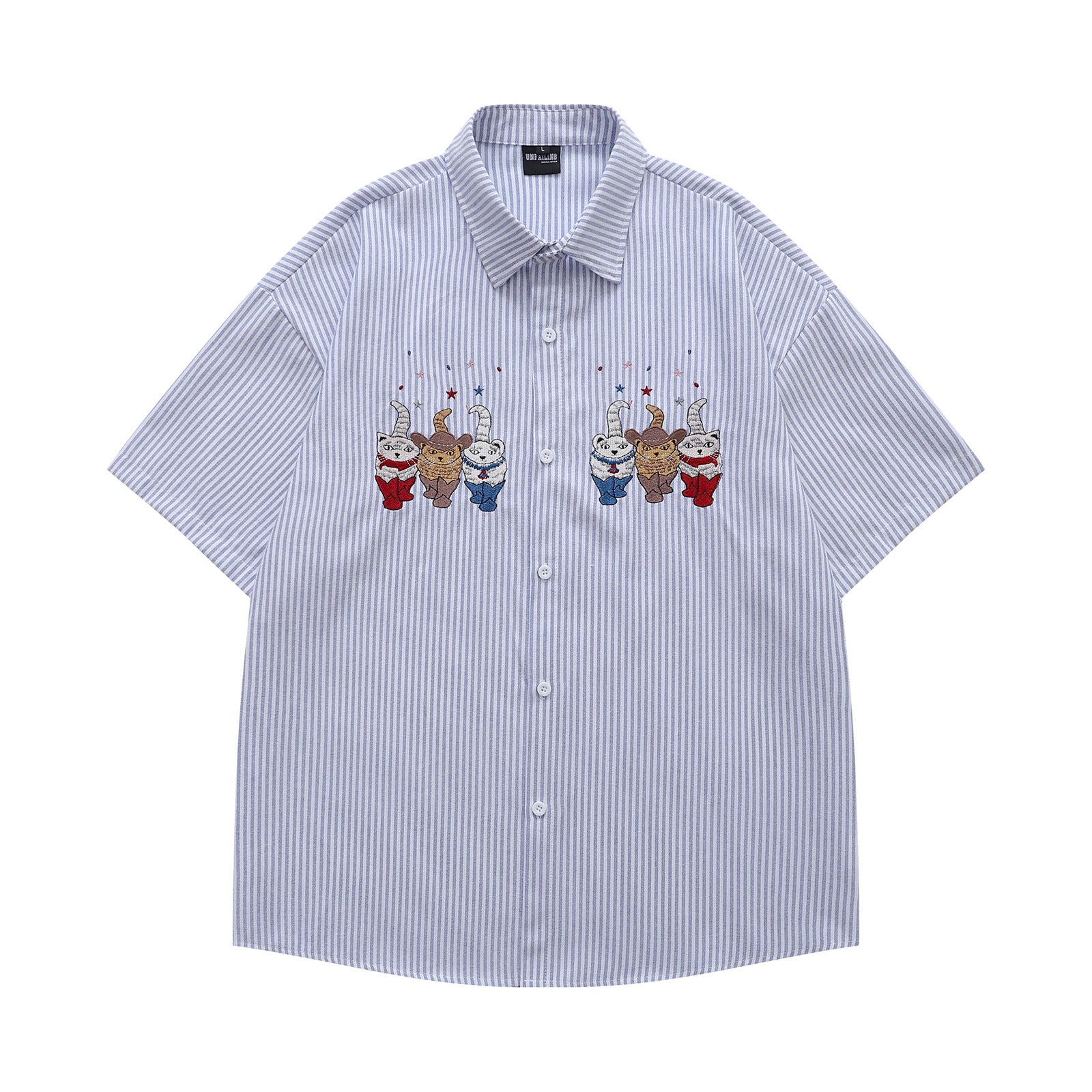 𝔼mbro 𝕊hirt𒉽日式復古可愛貓咪刺繡短袖百搭休閒襯衫 (藍色)