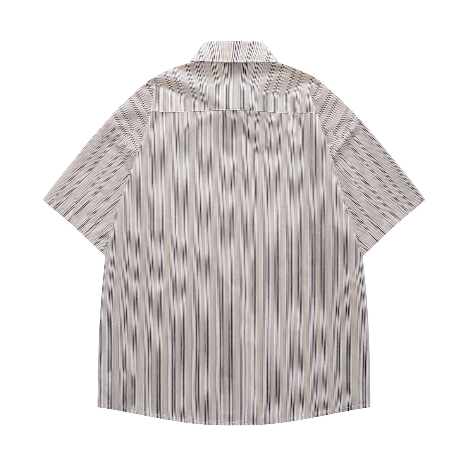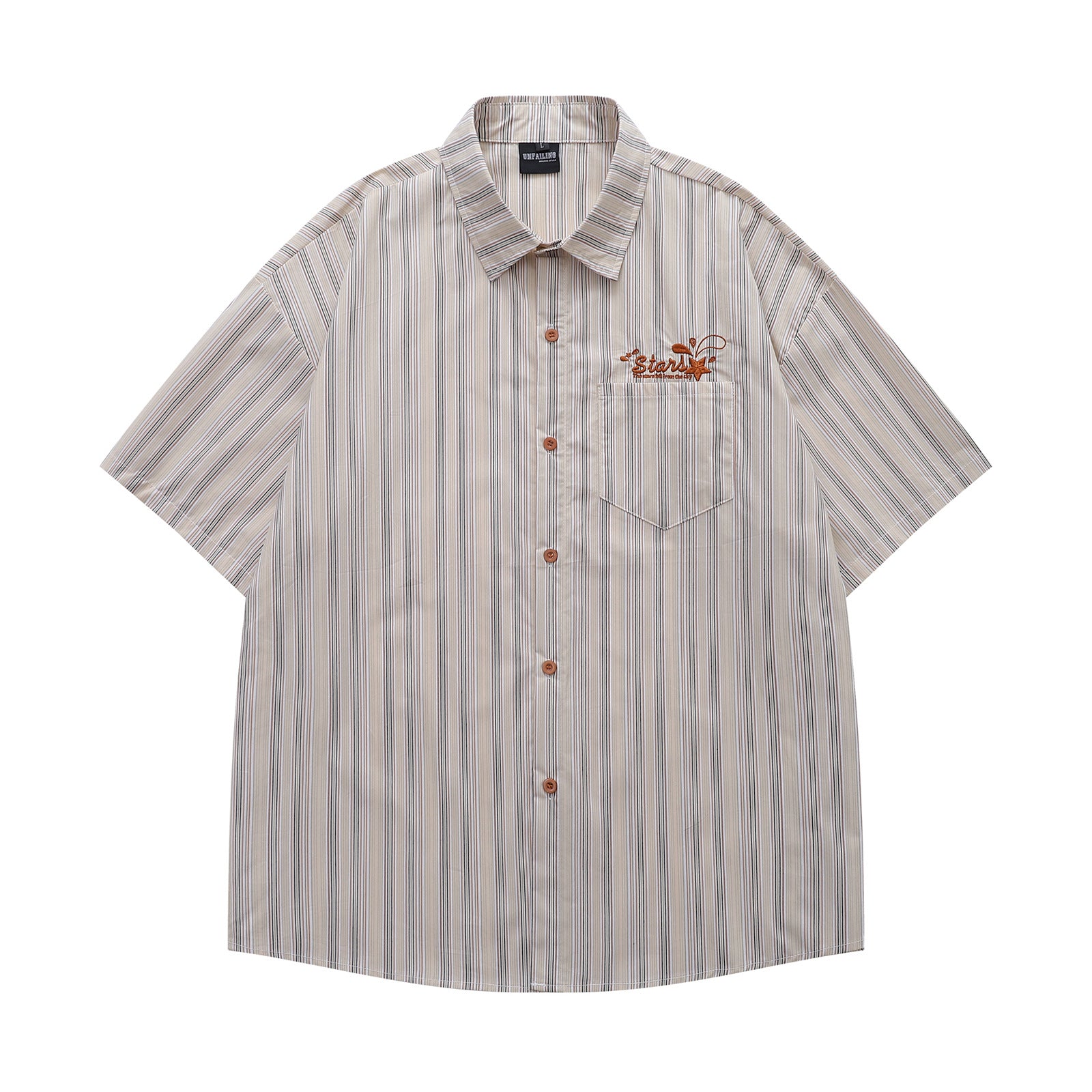 𝔼mbro 𝕊hirt𒉽日式復古字母刺繡條紋百搭休閒短袖襯衫 (杏色)