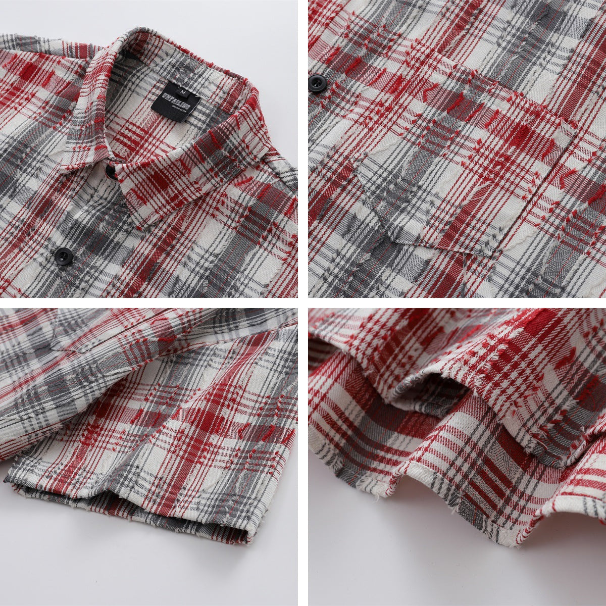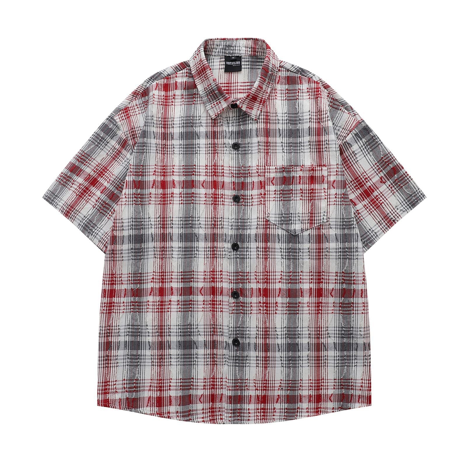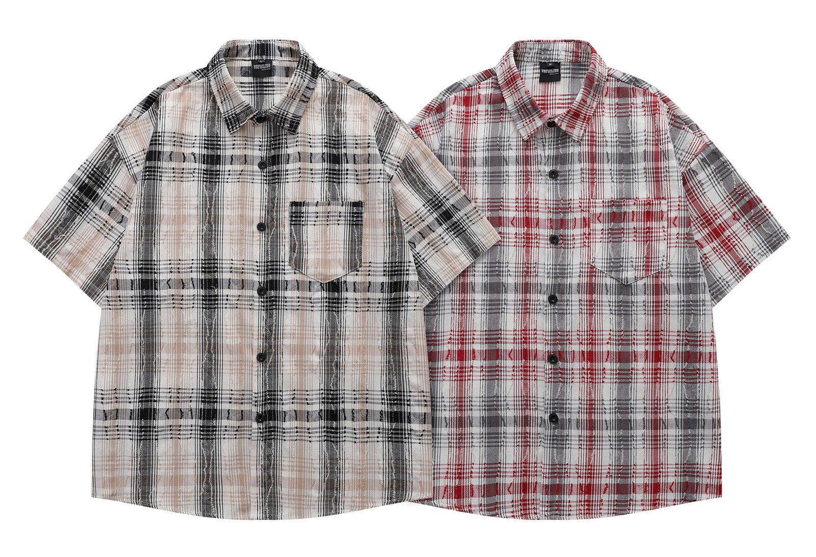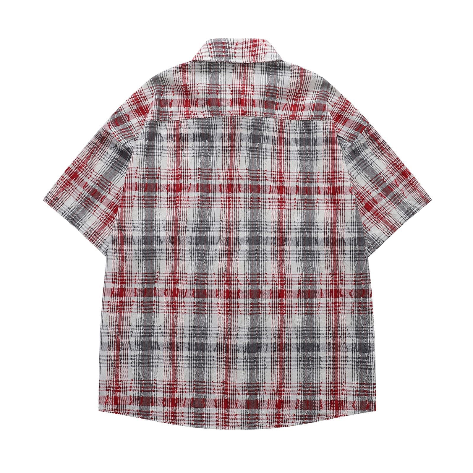 𝔼mbro 𝕊hirt𒉽日式復古毛邊格子短袖寬鬆襯衫YD-8