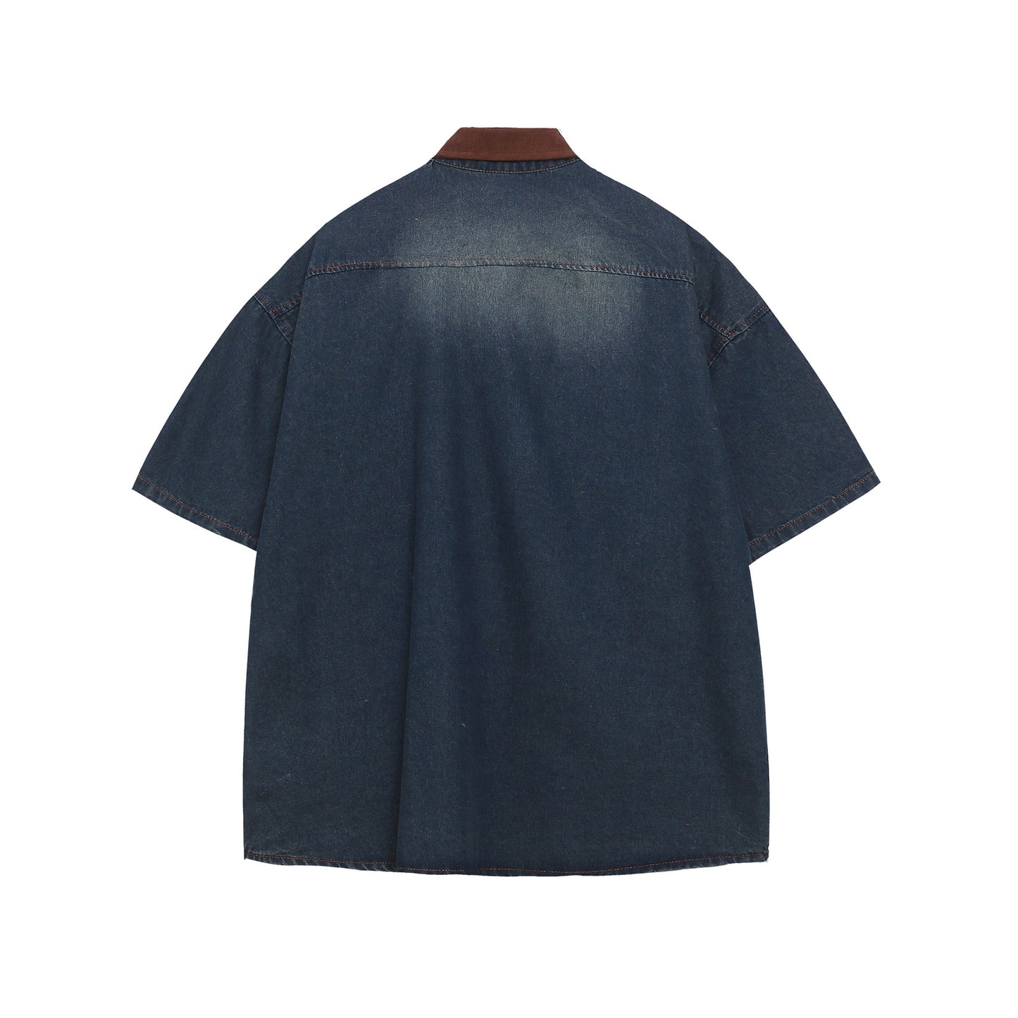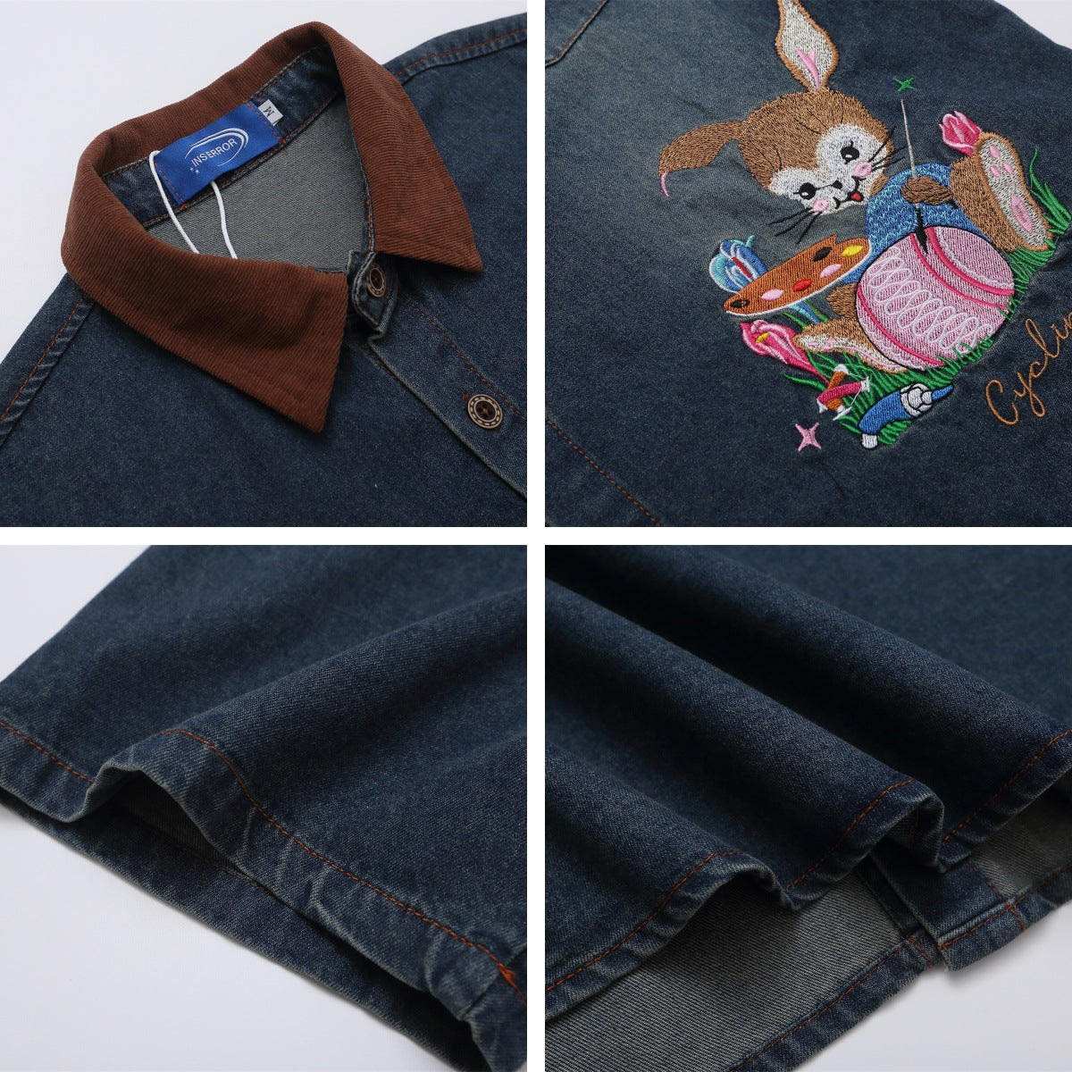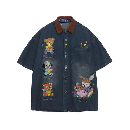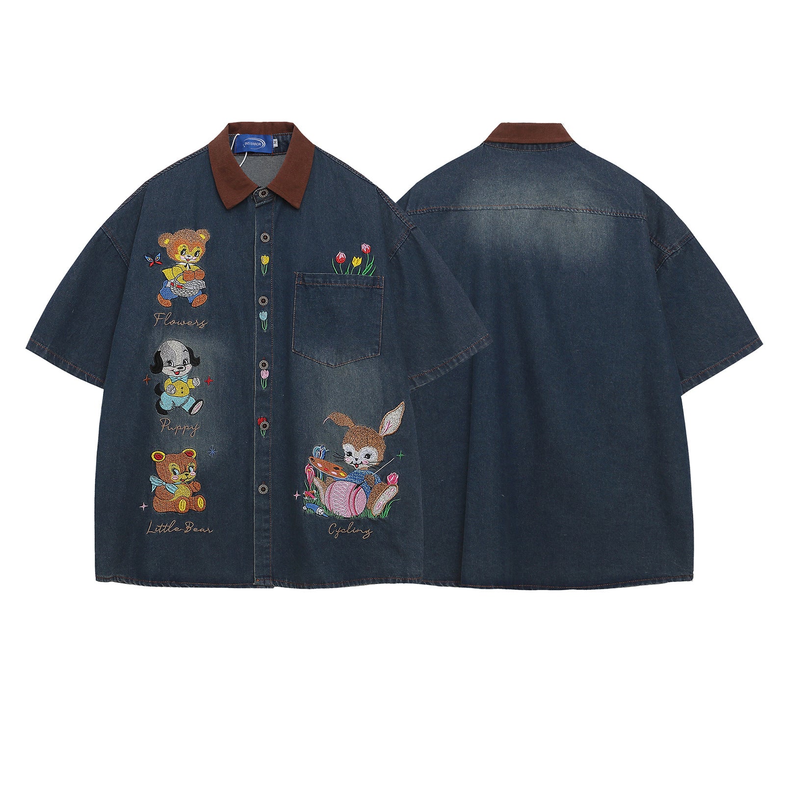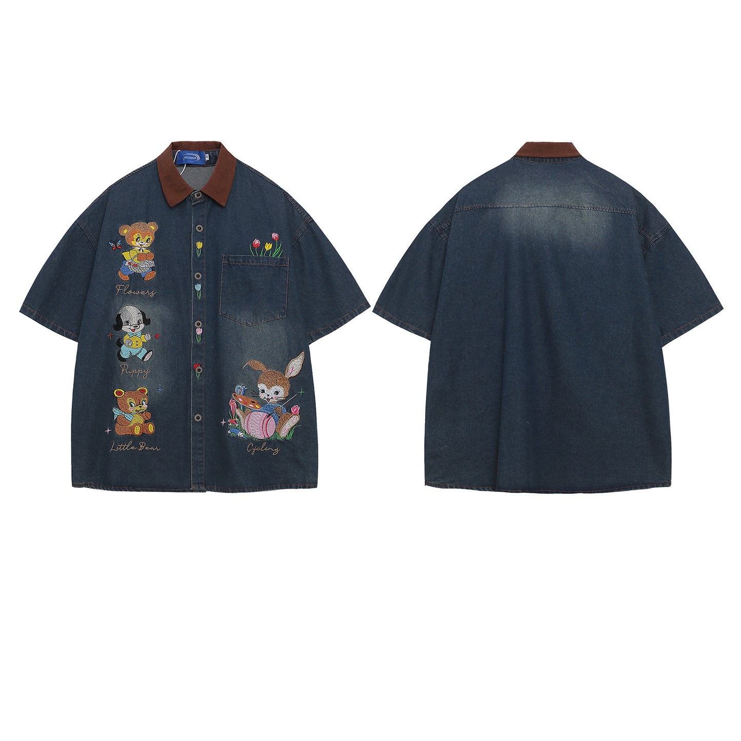 𝔼mbro 𝕊hirt𒉽趣味卡通繡花短袖牛仔襯衫外套