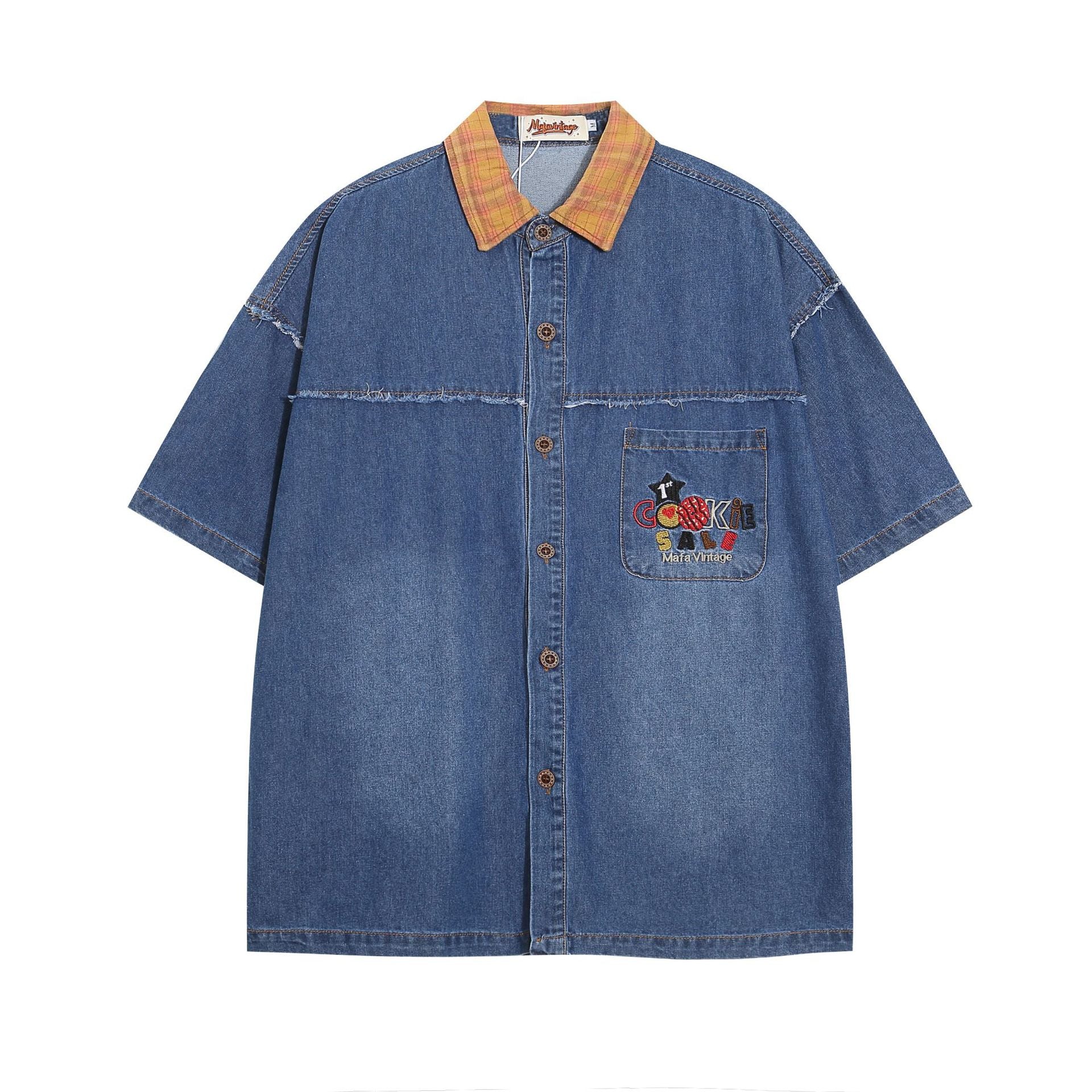 𝔼mbro 𝕊hirt𒉽美式復古Cookie字母刺繡牛仔寬鬆短袖襯衫外套