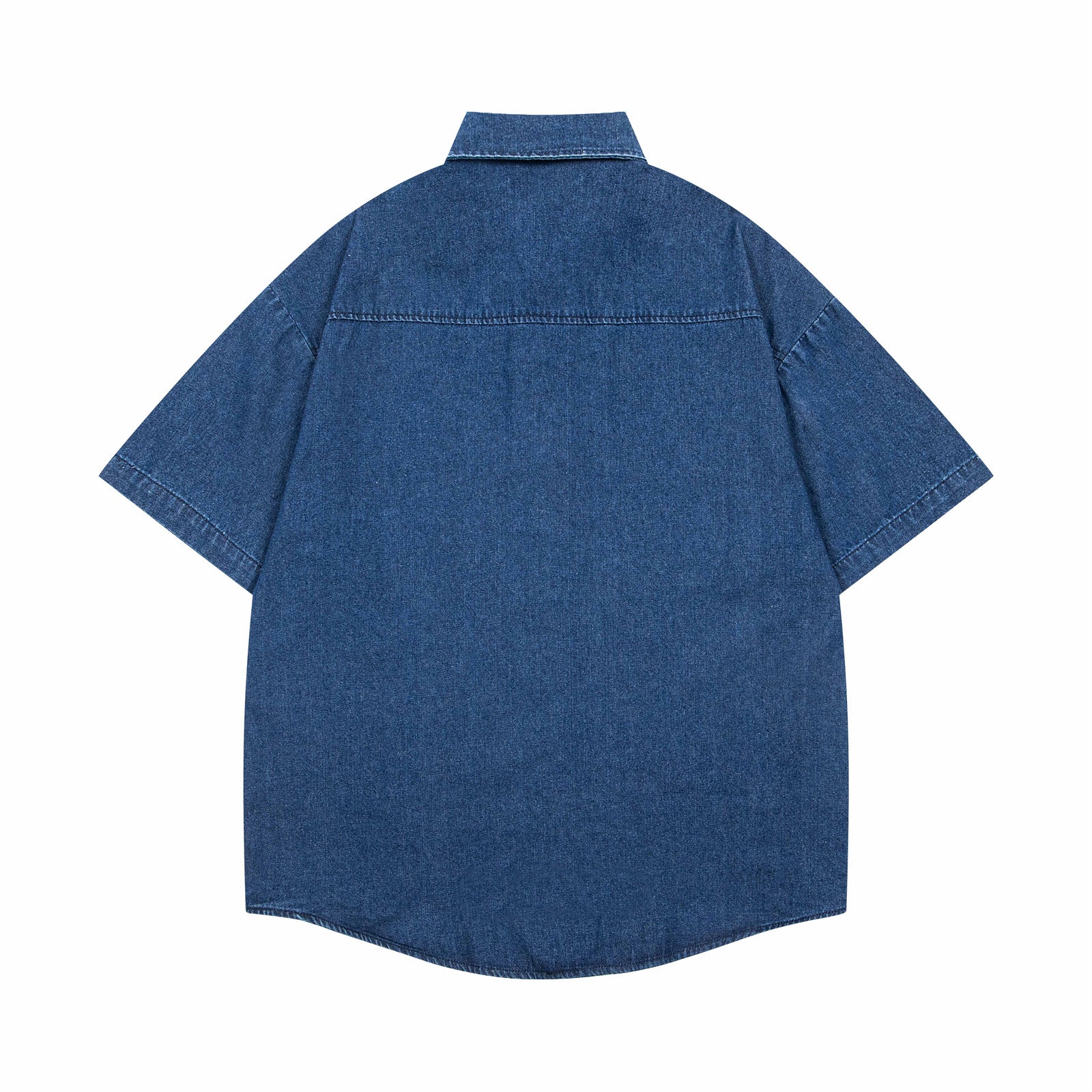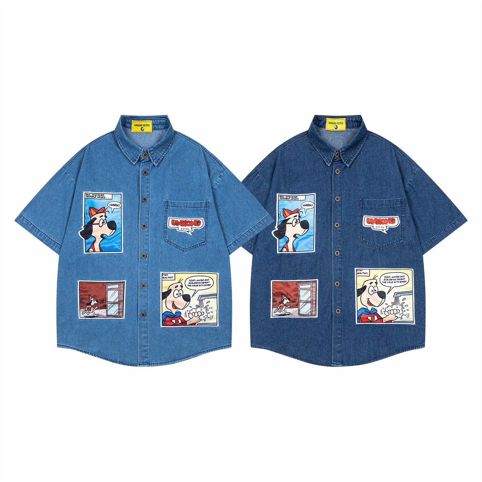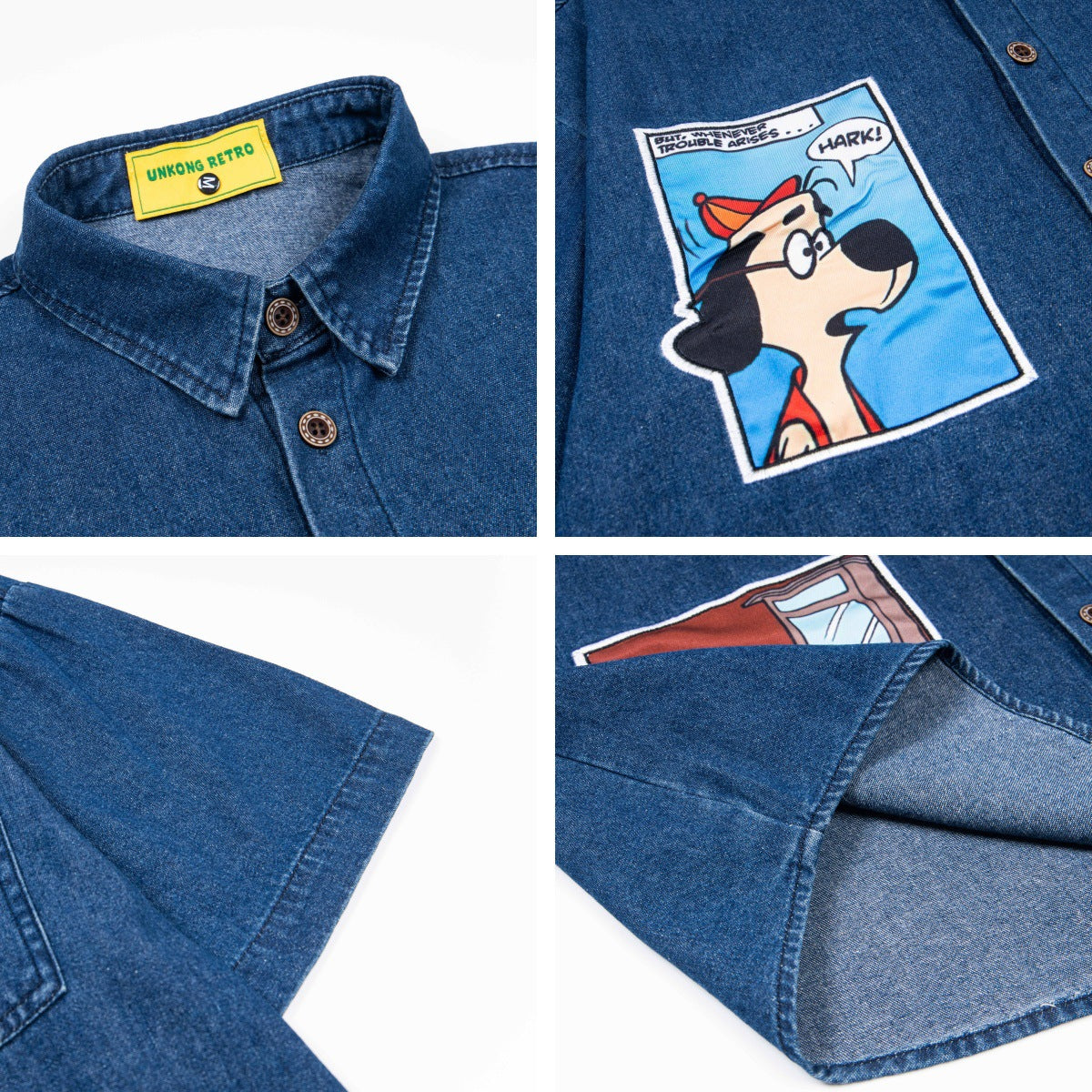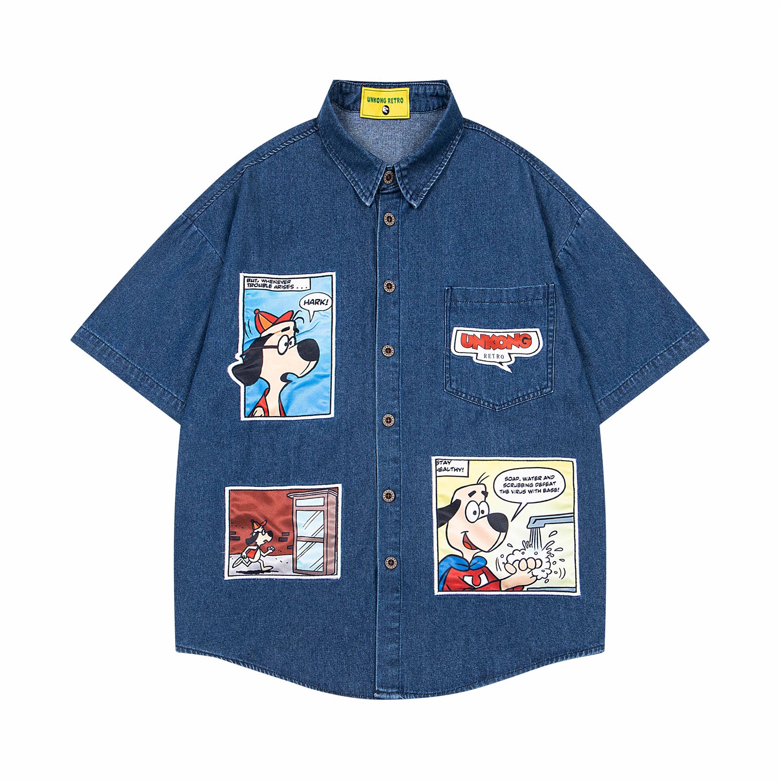 𝔼mbro 𝕊hirt𒉽美式復古趣味卡通貼布繡花短袖牛仔襯衫外套(深藍色)