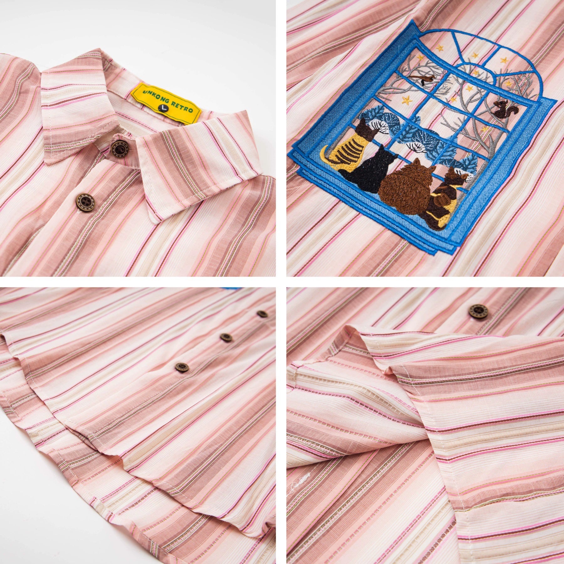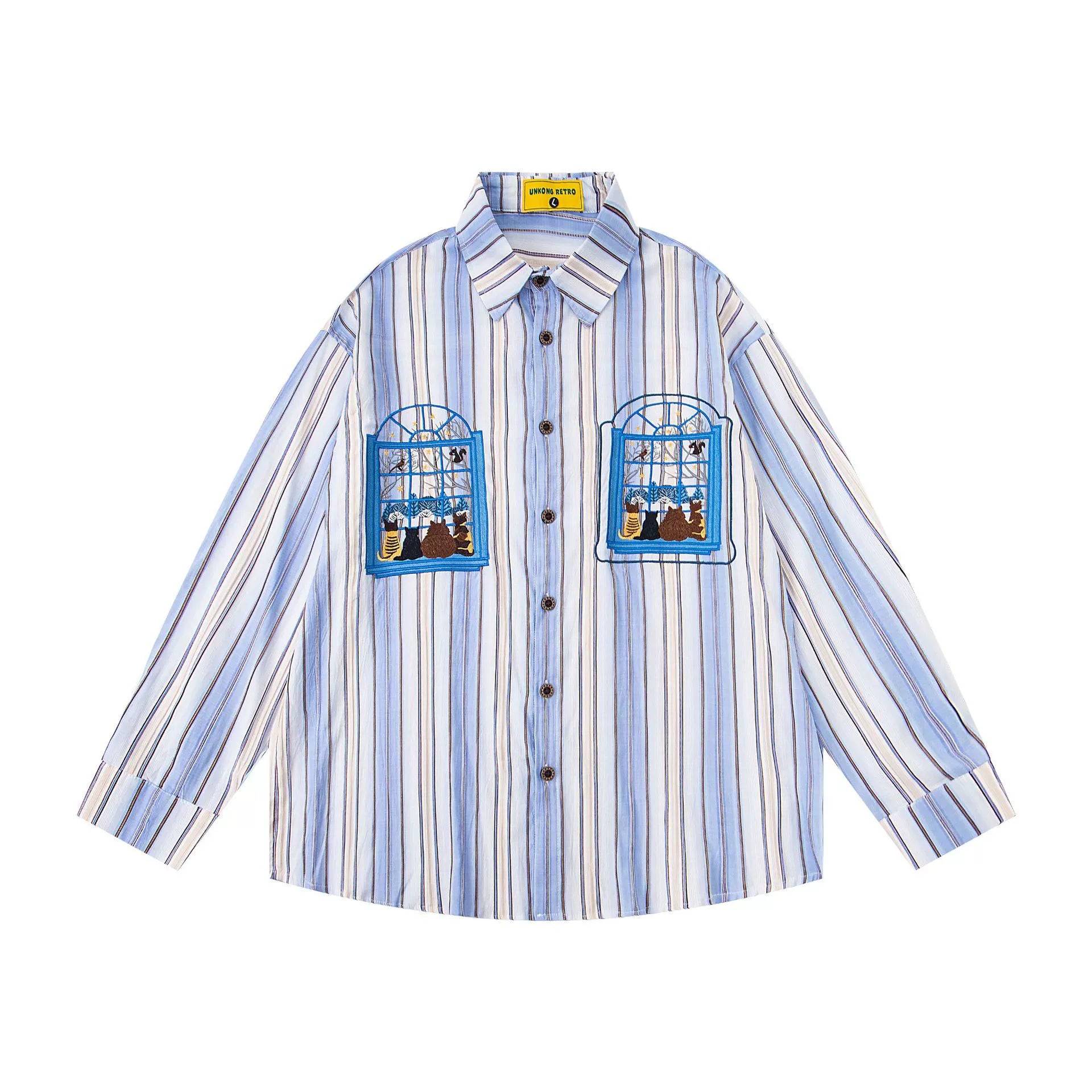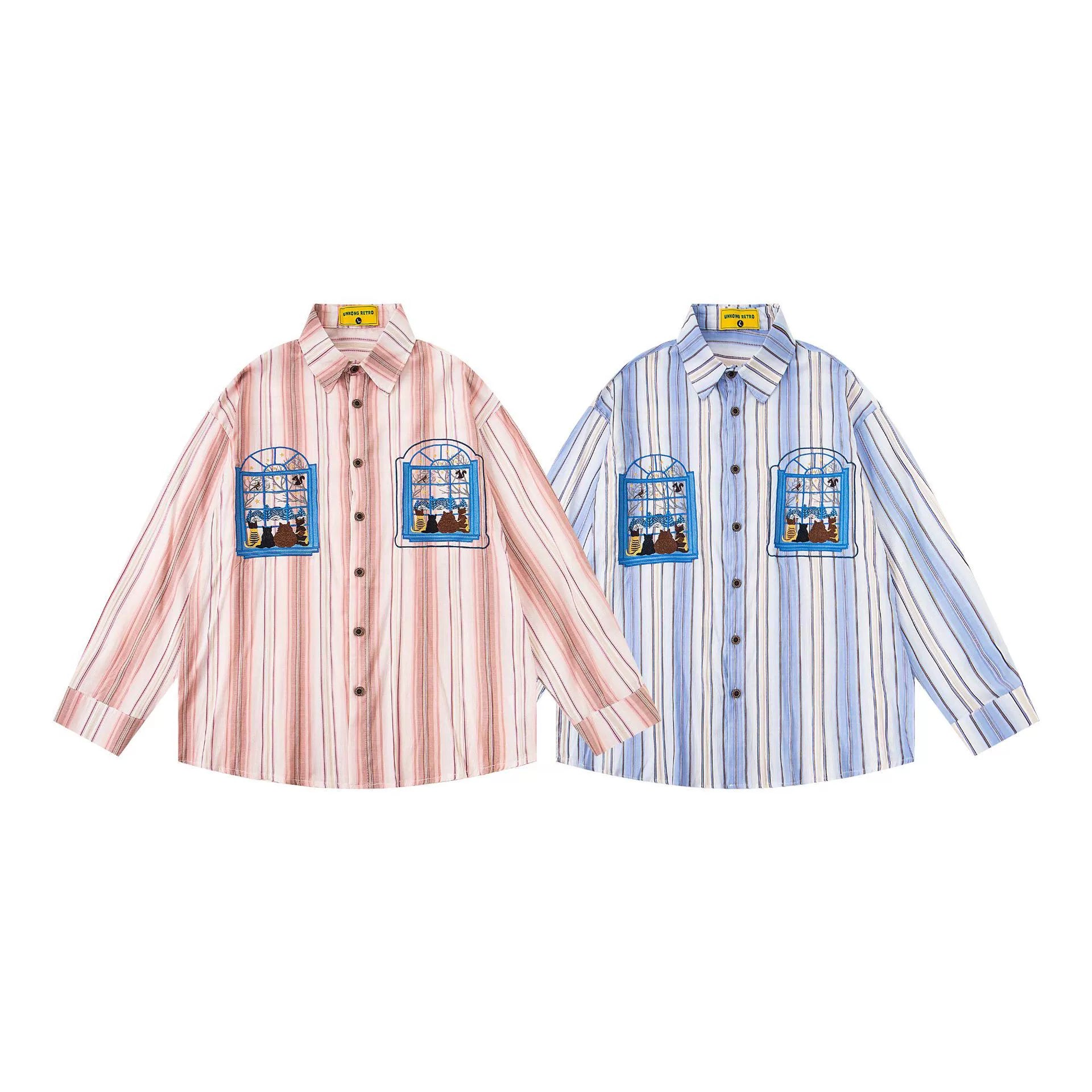 𝔼mbro 𝕊hirt𒉽2025秋冬小貓圖案刺繡條紋襯衫U-41