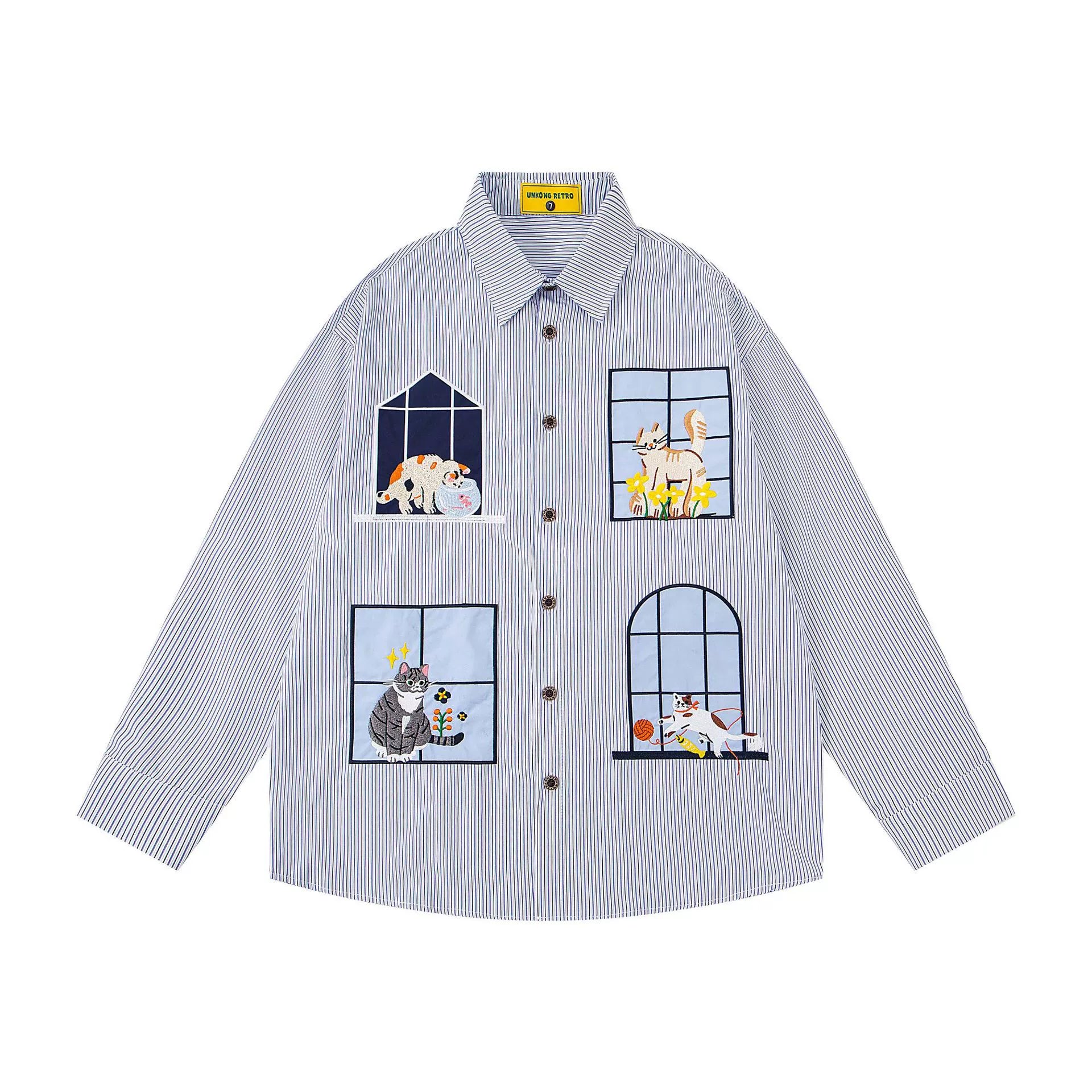 𝔼mbro 𝕊hirt𒉽2025秋冬小貓圖案刺繡條紋襯衫N-46