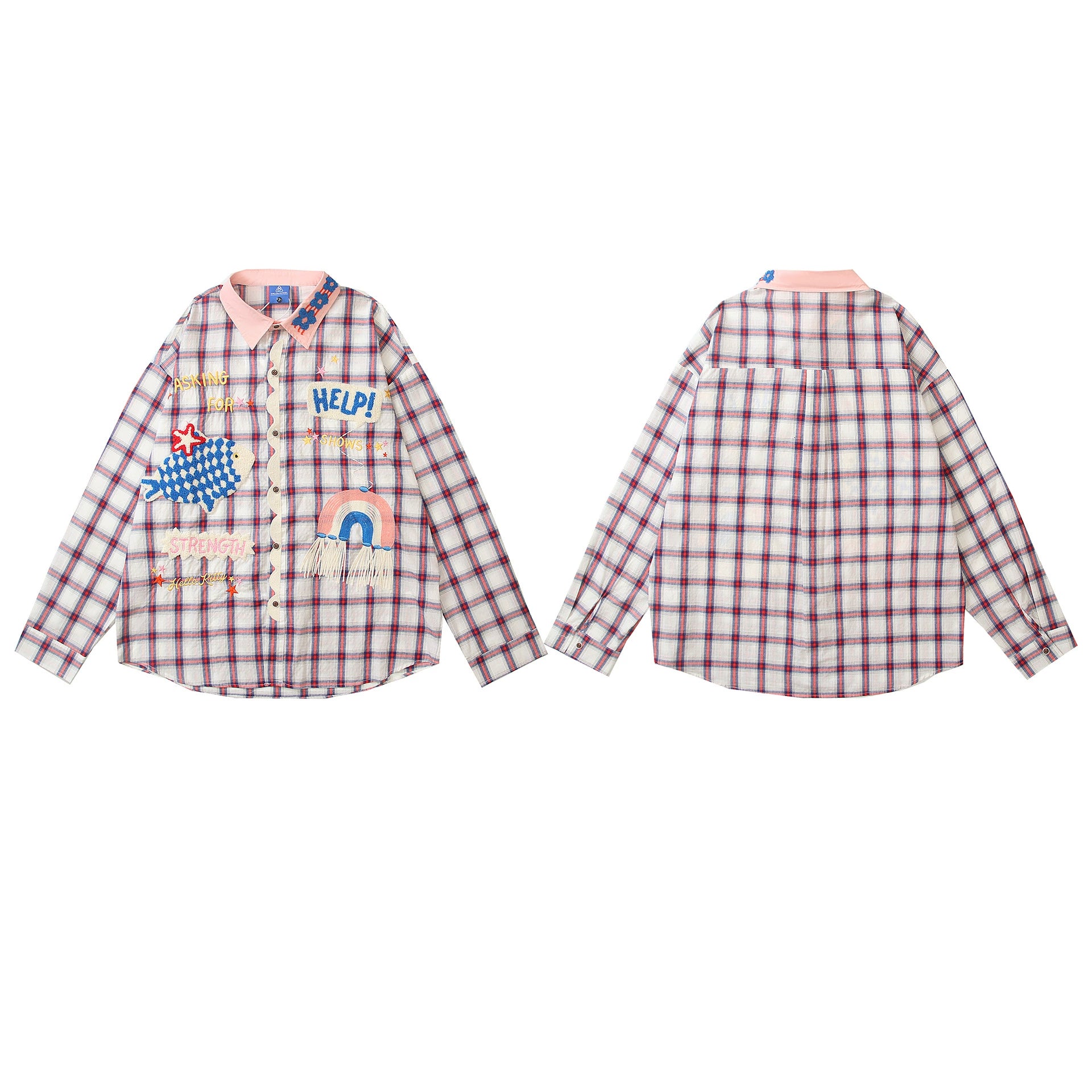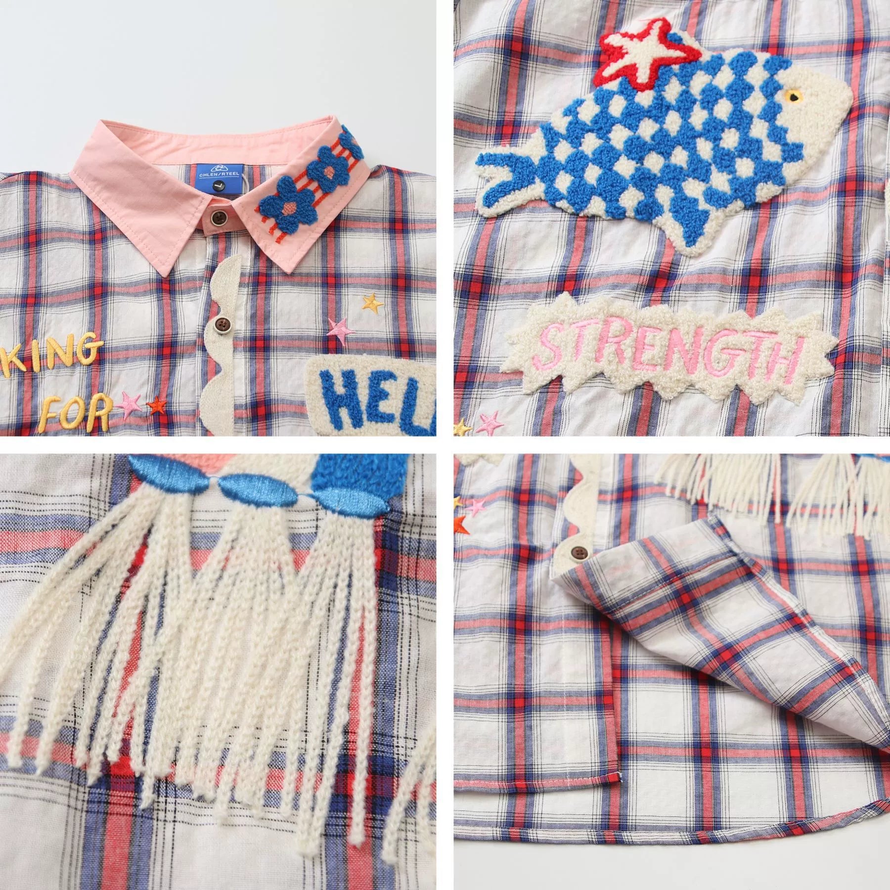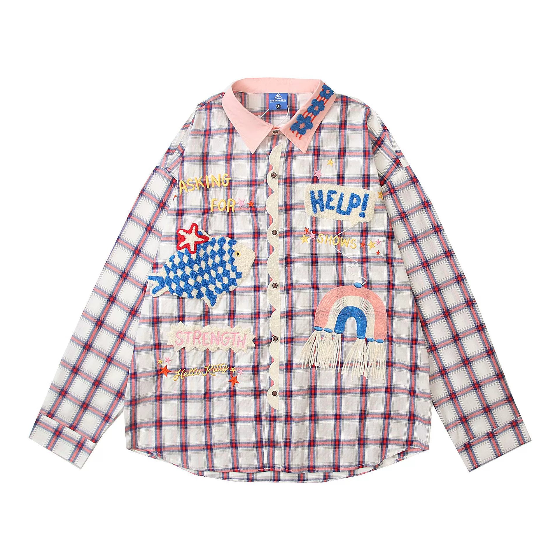 𝔼mbro 𝕊hirt𒉽2025秋冬復古小魚圖案寬鬆襯衫C-811