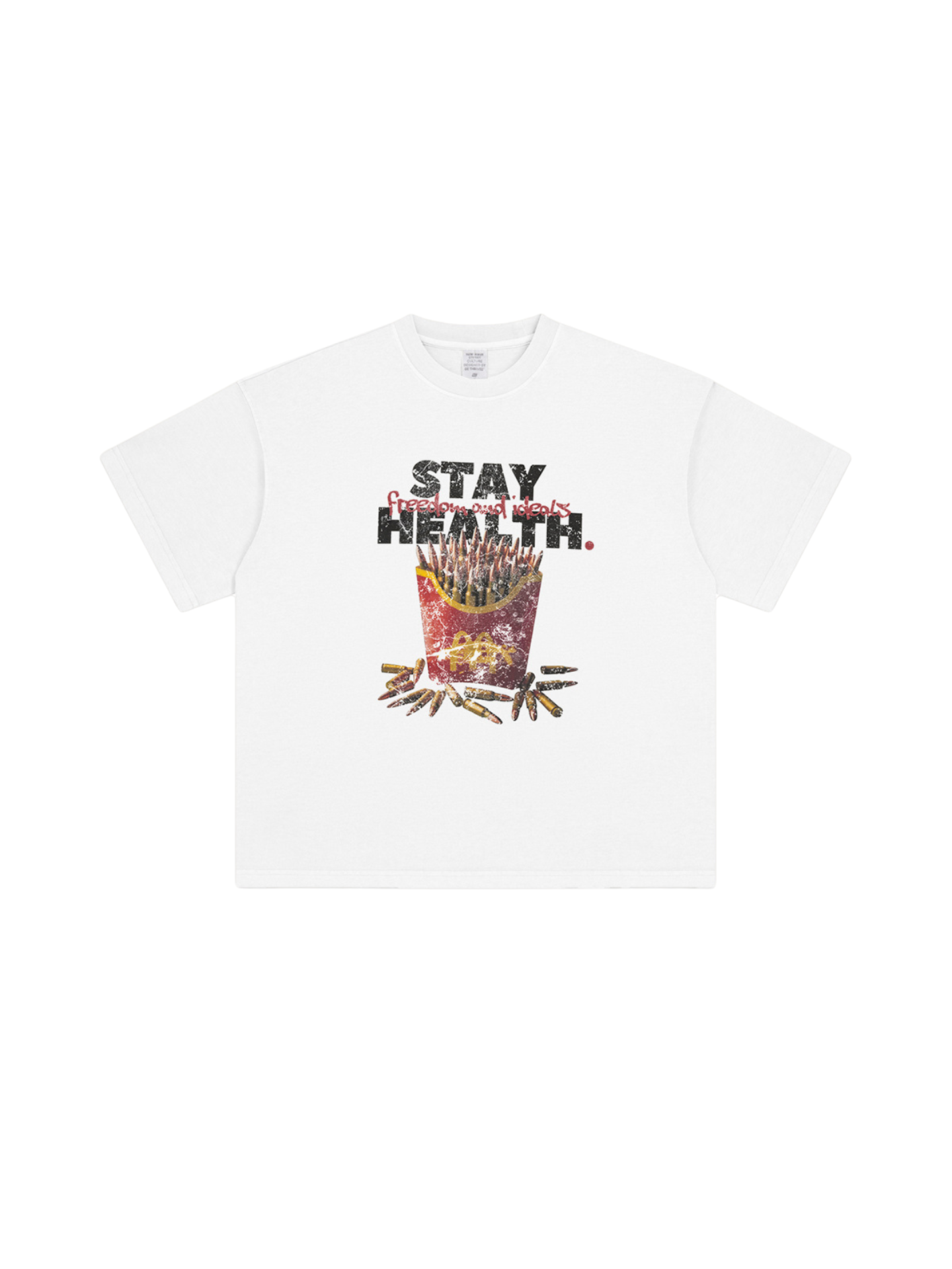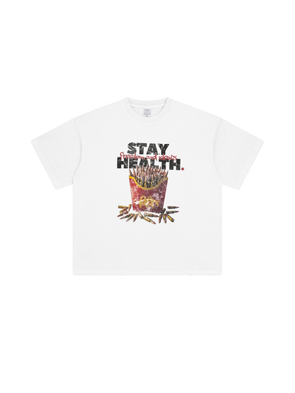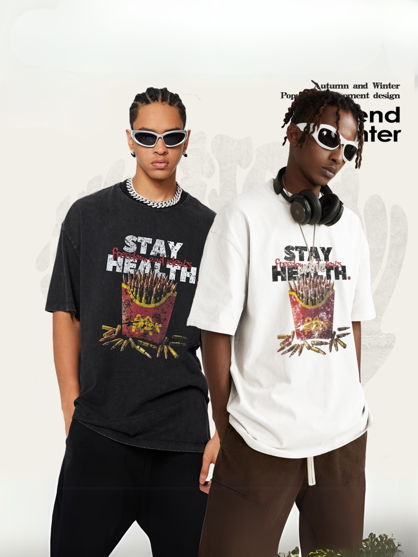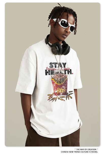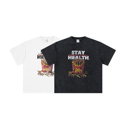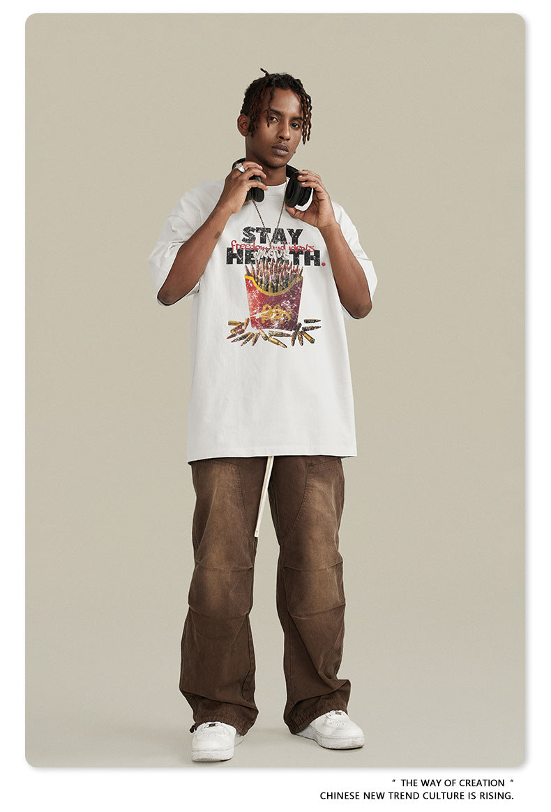 ▶𝔽𝕦𝕤𝕚𝕠𝕟 𝔽𝕠𝕔𝕦𝕤 ⌘𝓦𝓪𝓼𝓱𝓮𝓭 𝔀𝓲𝓷𝓭 ◀ 2025夏季歐美潮牌復古寬鬆上衣薯條印花惡搞短袖(白) TZ-08