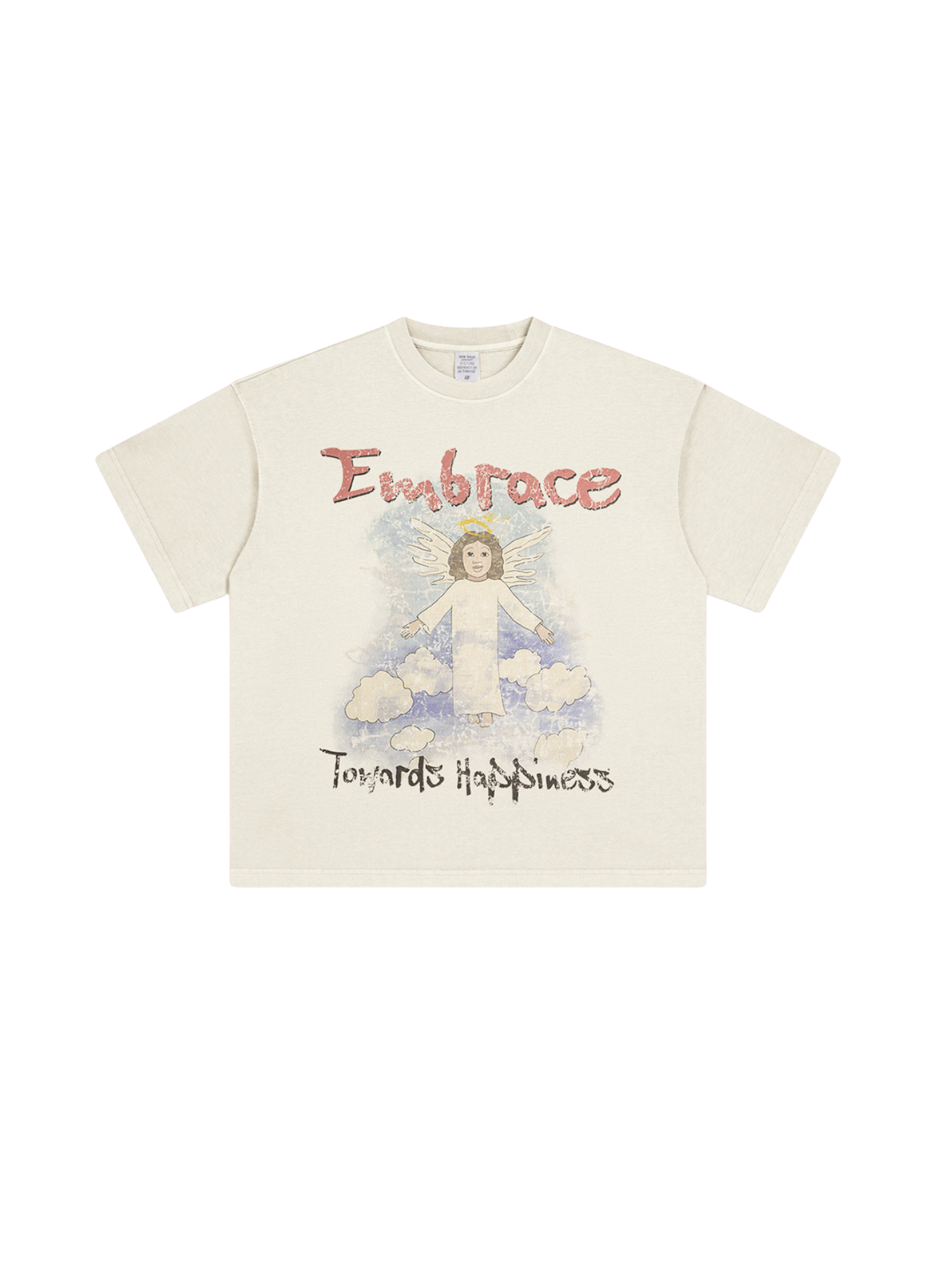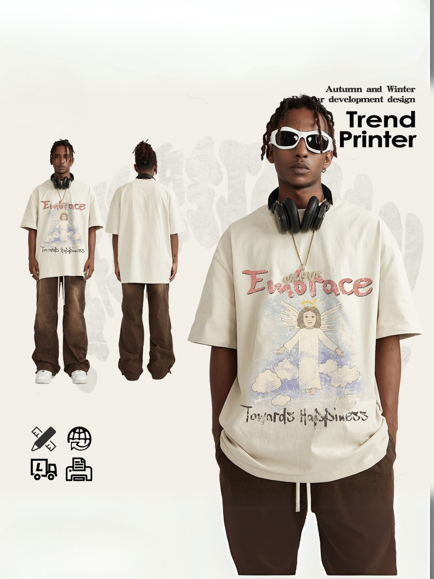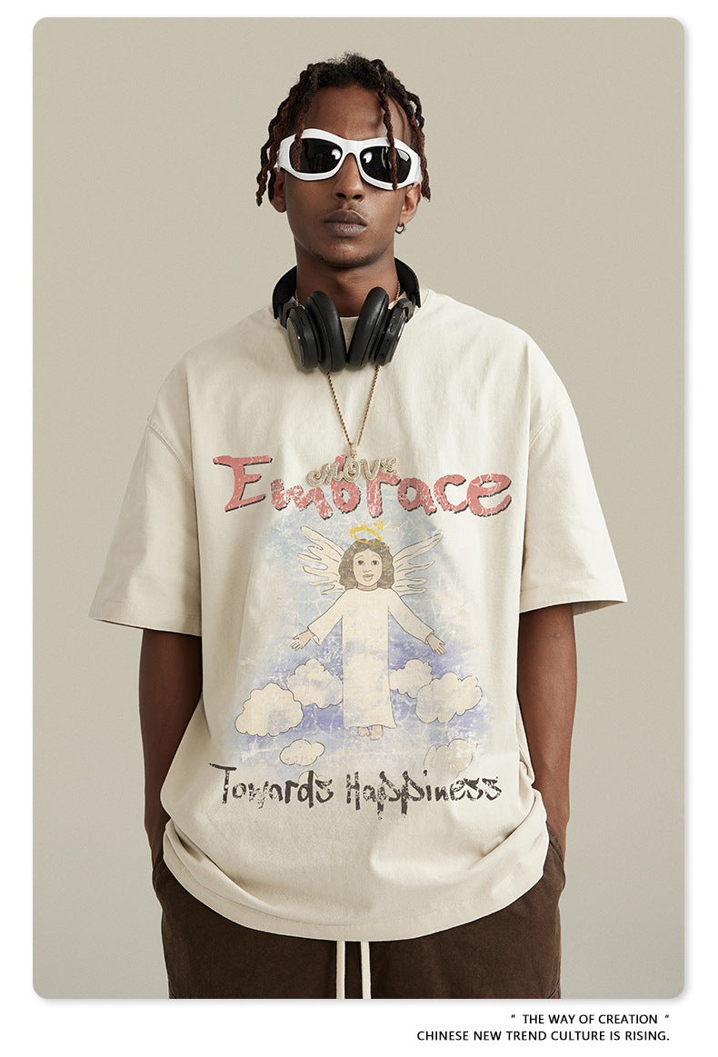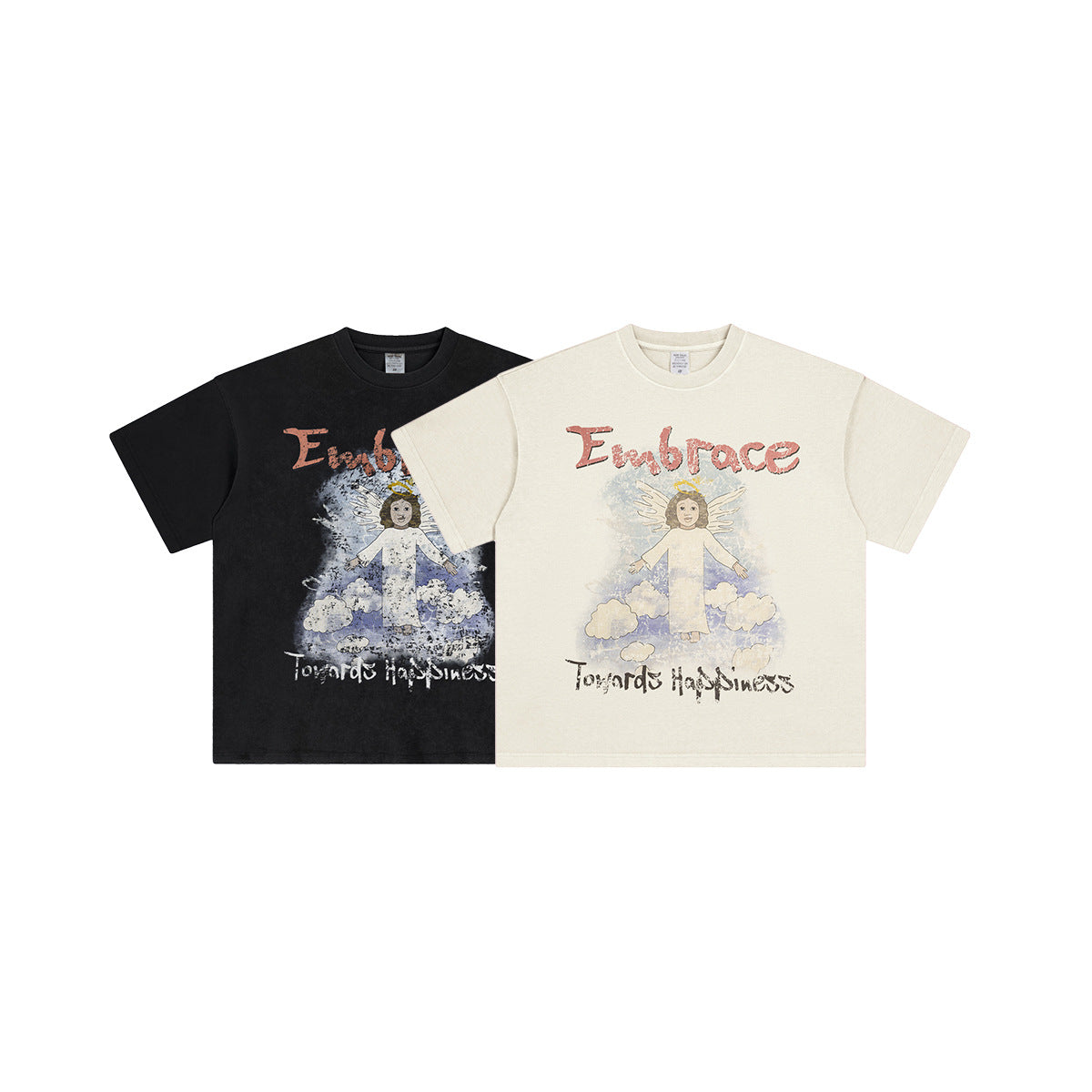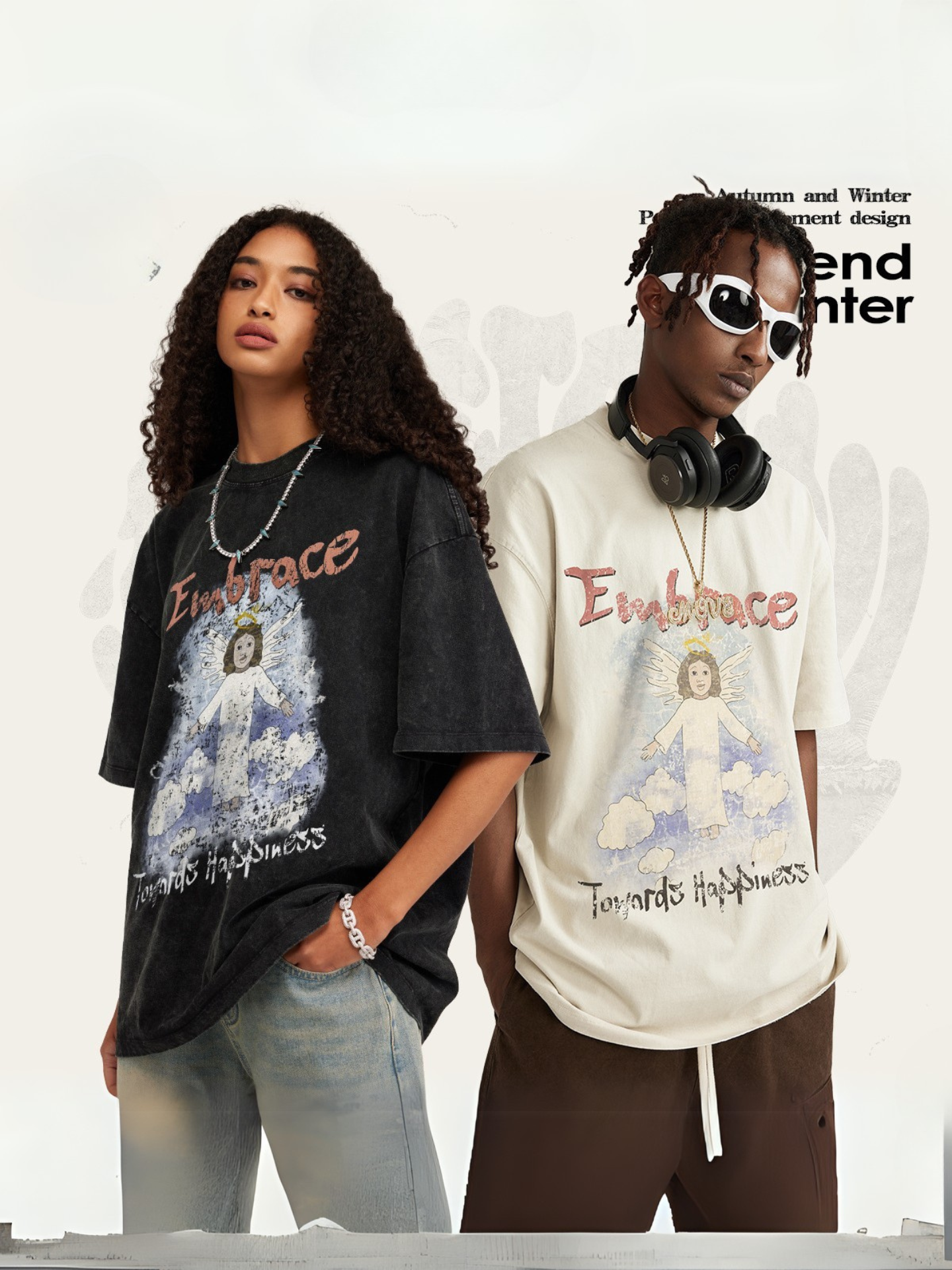 ▶𝔽𝕦𝕤𝕚𝕠𝕟 𝔽𝕠𝕔𝕦𝕤 ⌘𝓦𝓪𝓼𝓱𝓮𝓭 𝔀𝓲𝓷𝓭 ◀ 2025春季新款復古街頭潮牌ins水洗天使印花圓領寬鬆大碼短袖 TZ-09
