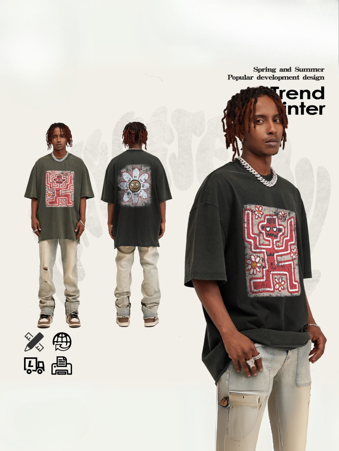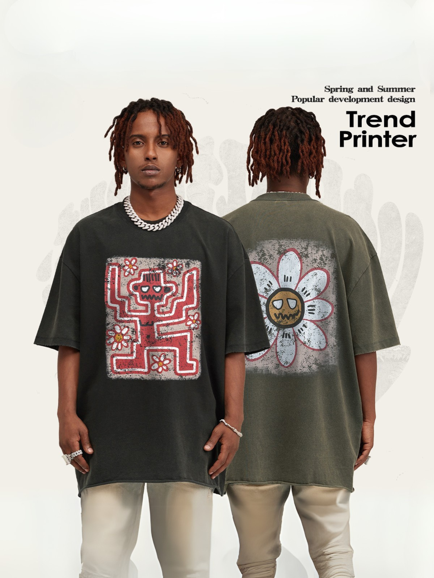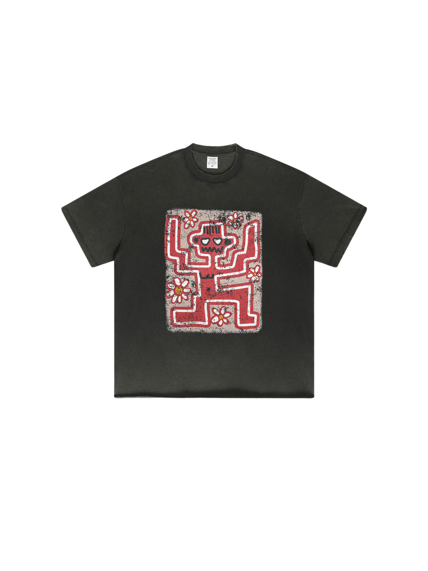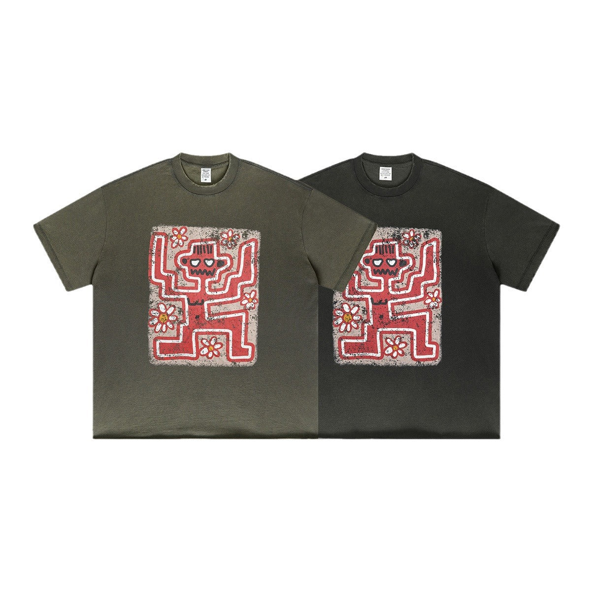 ▶𝔽𝕦𝕤𝕚𝕠𝕟 𝔽𝕠𝕔𝕦𝕤 ⌘𝓦𝓪𝓼𝓱𝓮𝓭 𝔀𝓲𝓷𝓭 ◀ 2025美式復古潮牌水洗做舊趣味花朵印花短袖Vintage街頭寬鬆T恤 TZ-15