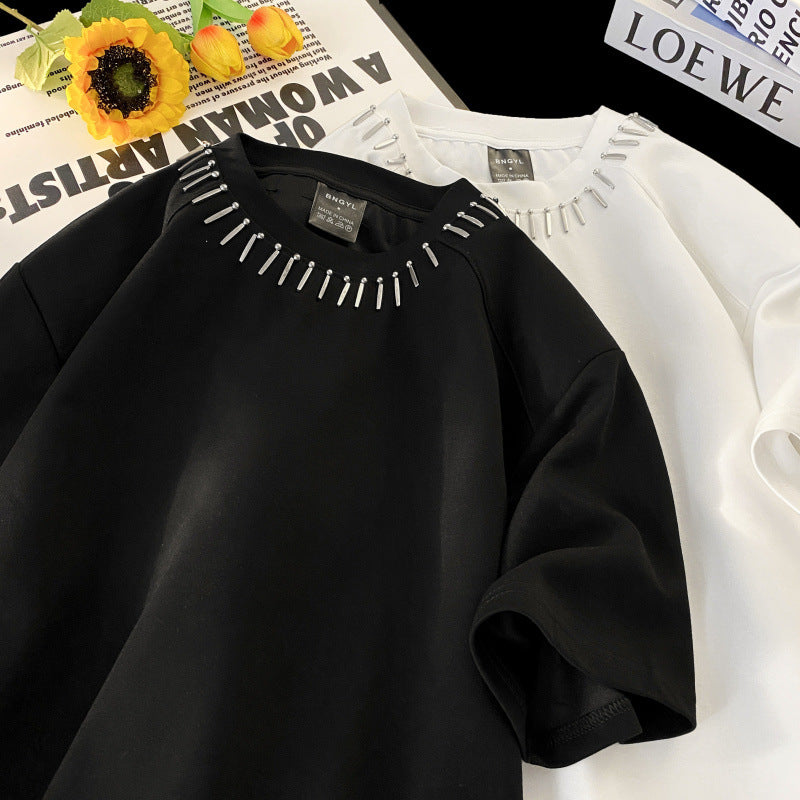 𝔽𝕦𝕤𝕚𝕠𝕟 𝔽𝕠𝕔𝕦𝕤 ✘ cleanfit黑色墊肩短袖男夏季金屬設計感小眾高級感痞帥小領口t恤 W115