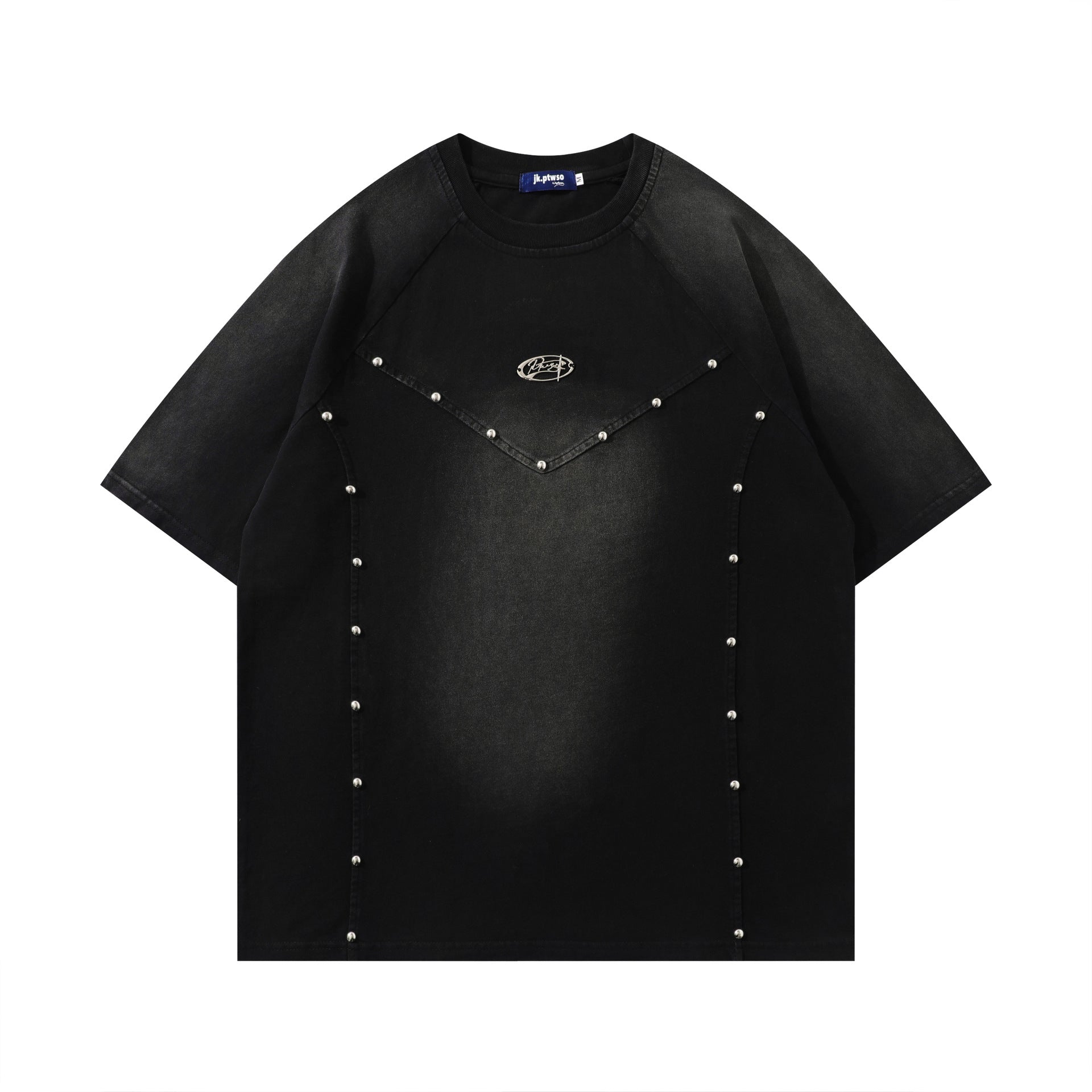 𝕃oose 𝔽it ☞𝟤𝟢𝟤𝟧 ☜美式復古拼接鉚釘圓領男女中性 T-Shirt寬版上衣J-5