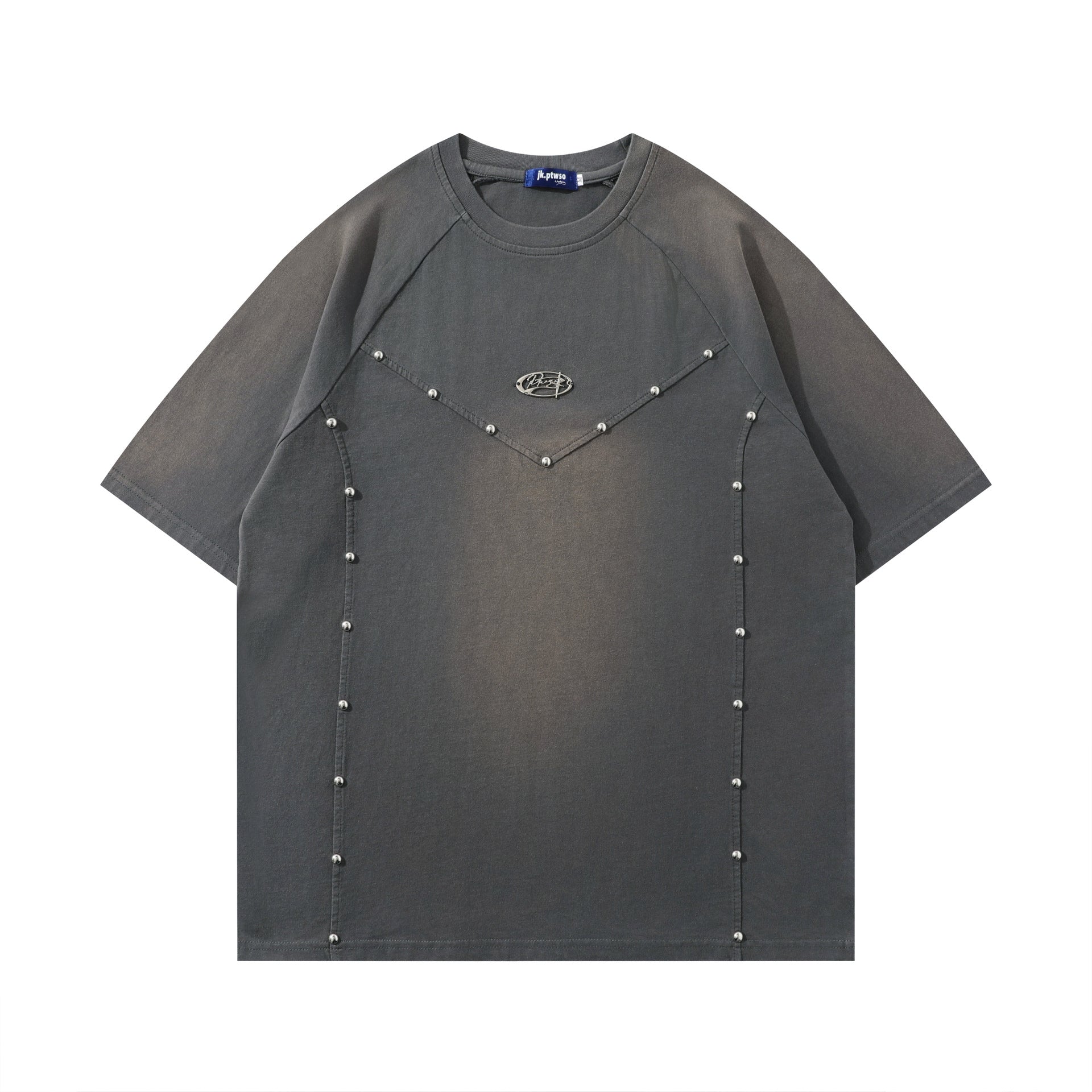 𝕃oose 𝔽it ☞𝟤𝟢𝟤𝟧 ☜美式復古拼接鉚釘圓領男女中性 T-Shirt寬版上衣J-5