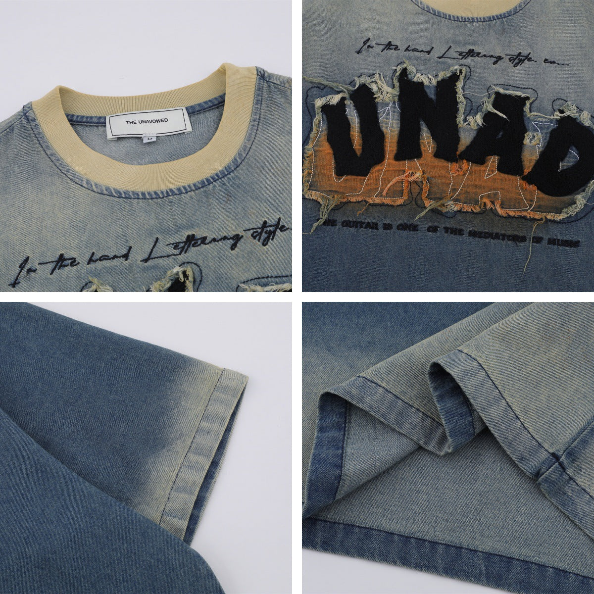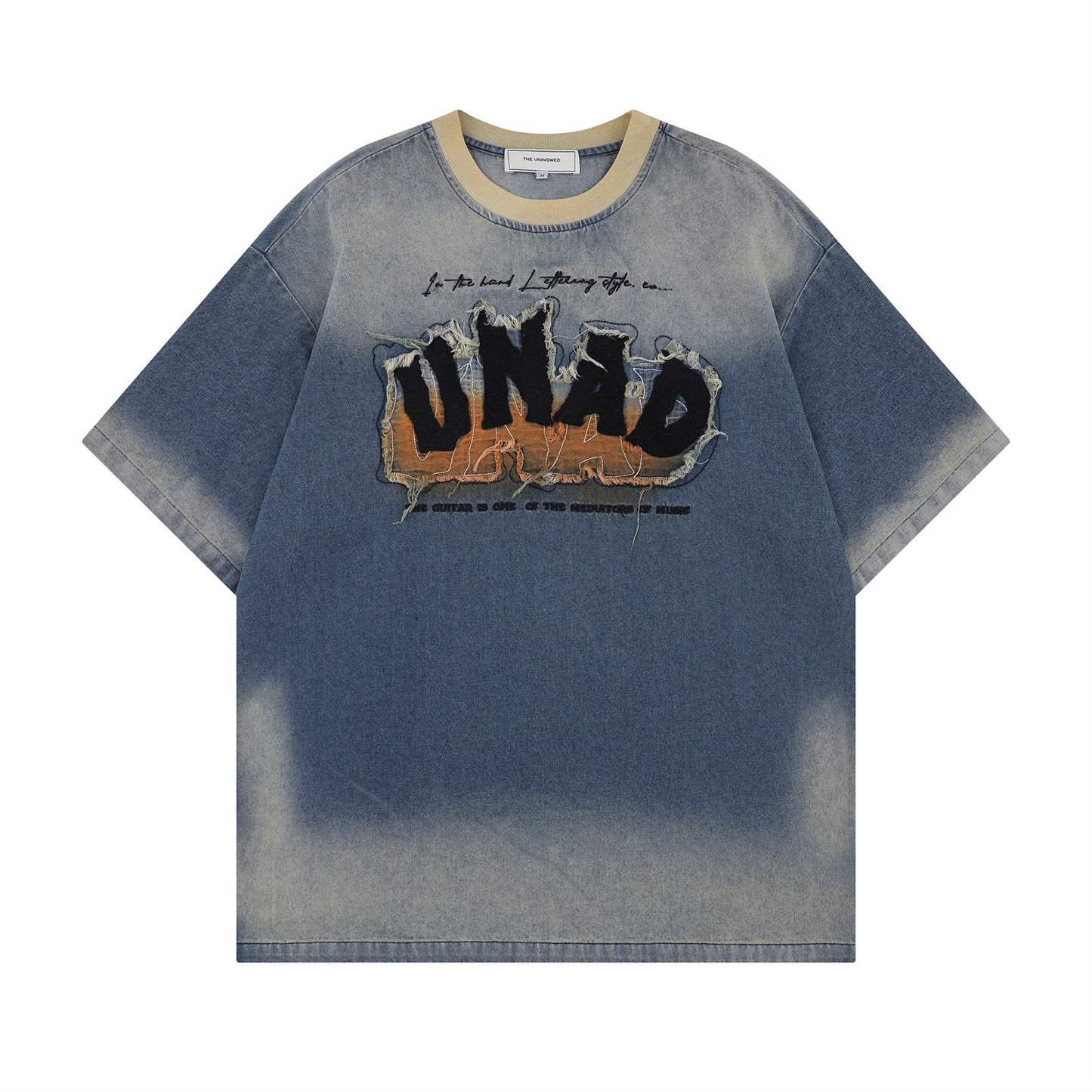 𝕃oose 𝔽it ☞𝟤𝟢𝟤𝟧 ☜美式復古牛仔做舊字母刺繡風格男女中性 T-Shirt寬版上衣 TH533