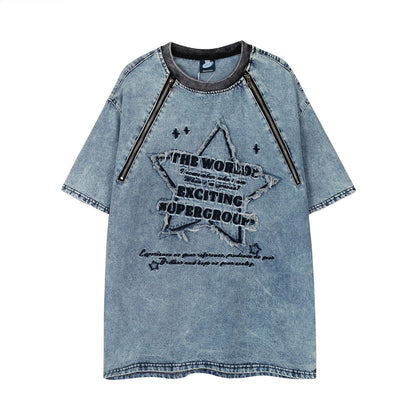 𝕃oose 𝔽it ☞𝟤𝟢𝟤𝟧 ☜美式做舊水洗拉鍊設計圓領男女中性 T-Shirt寬版上衣 G-727