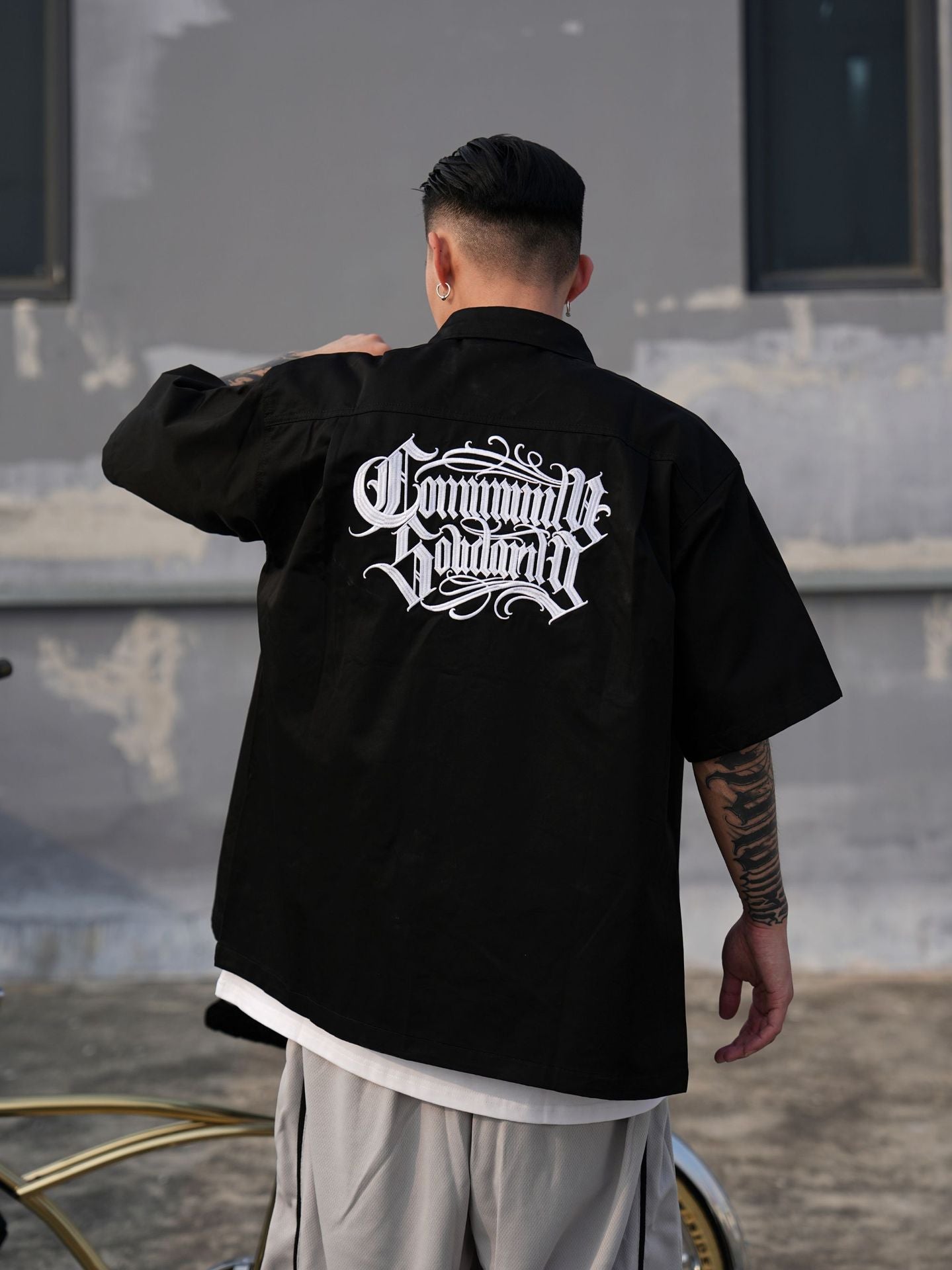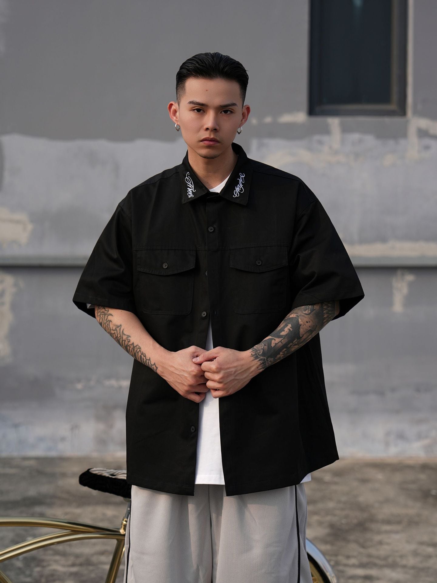 𝔽𝕦𝕤𝕚𝕠𝕟 𝔽𝕠𝕔𝕦𝕤-ᴄʜɪᴄᴀɴᴏ♠︎悍匪♠︎美式嘻哈寬鬆經典刺繡重磅工裝短袖襯衫