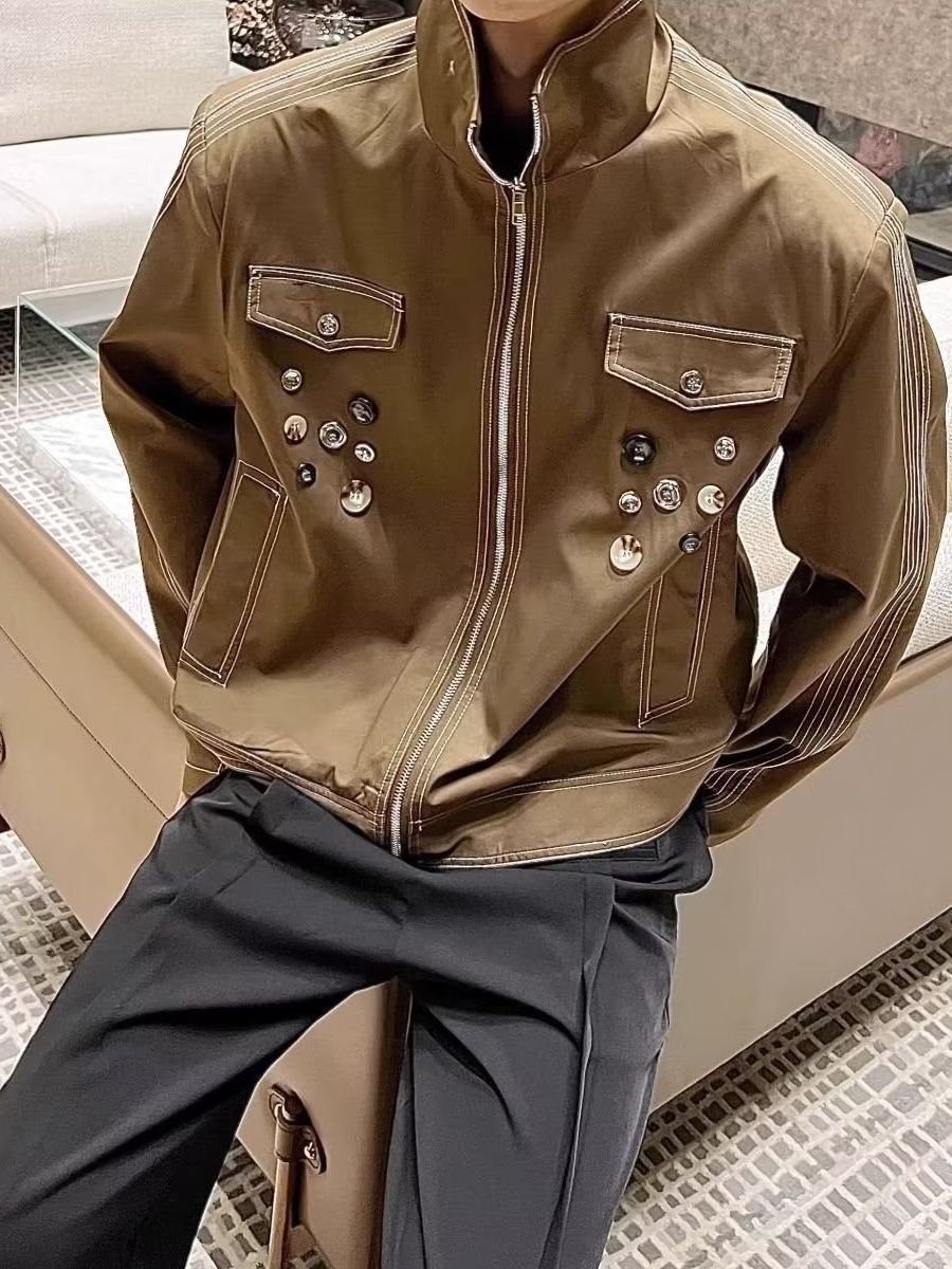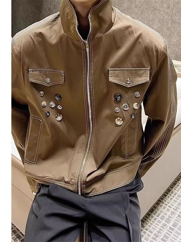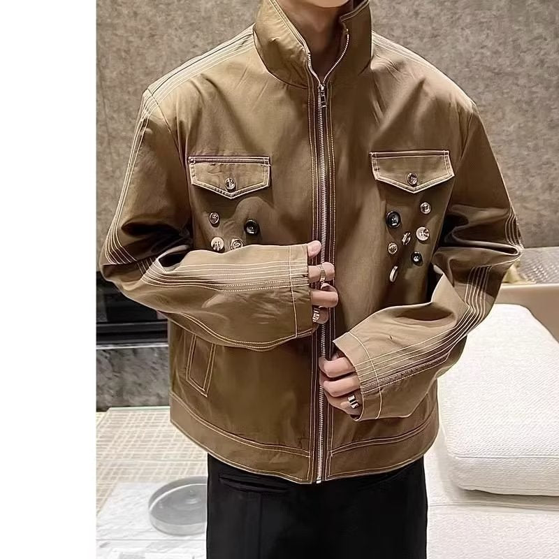 snɔoɟ uoı̣snɟ - 美式夾克男女中性風不規則設計感纽扣裝飾百搭寬鬆情侣休閒短外套 Bc-002