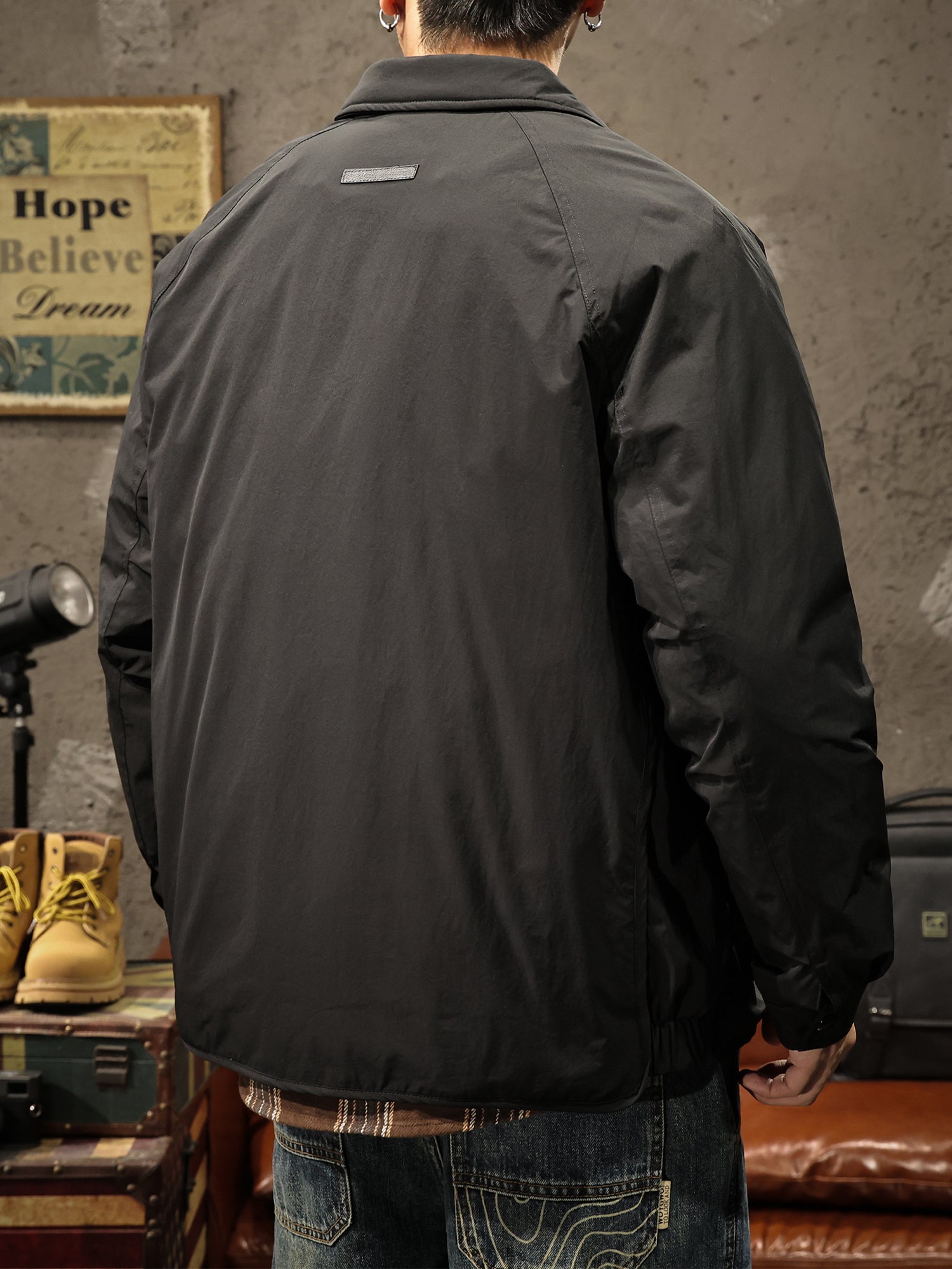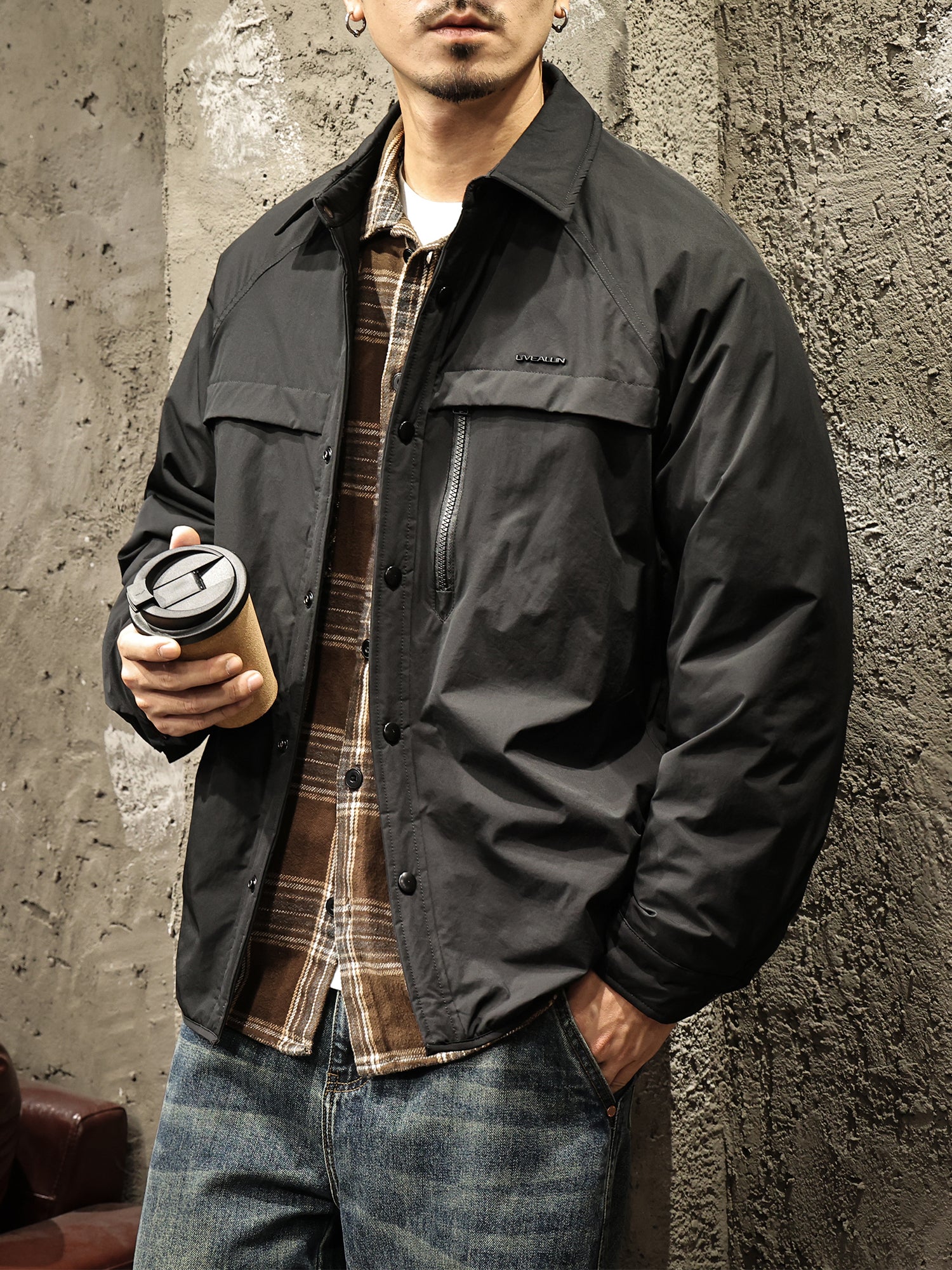 snɔoɟ uoı̣snɟ - 2025潮牌簡約工裝風短款羽绒服男士黑色翻領保暖百搭外套男羽绒服 FG-359