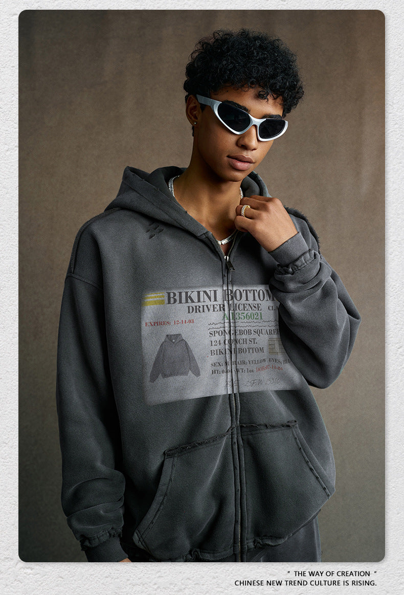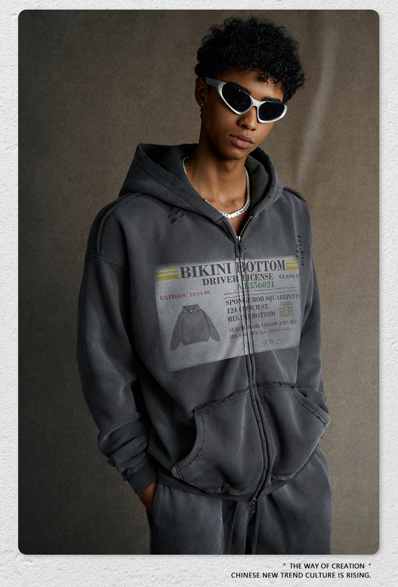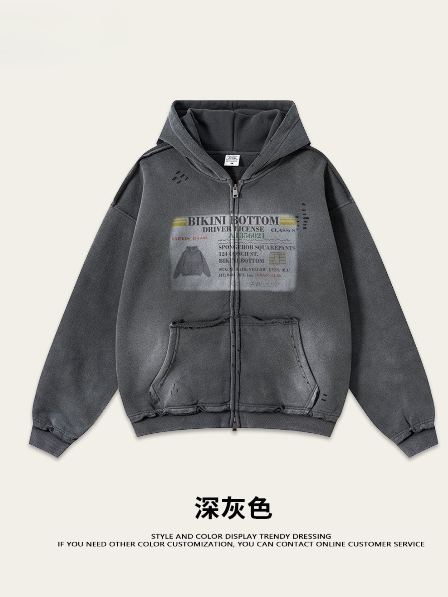 snɔoɟ uoı̣snɟ - 2025秋冬美式潮牌做舊水洗印花連帽開衫拉鏈外套 E-761